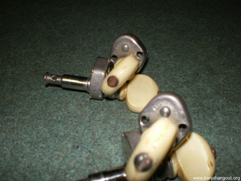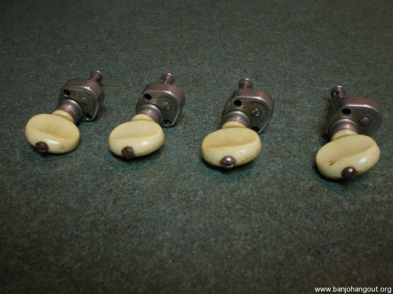 Four Grover Patent tuners, Pre WW2 vintage, triangular-shaped gear housing. Mechanism turns fine but probably needs flushing and lubrication.