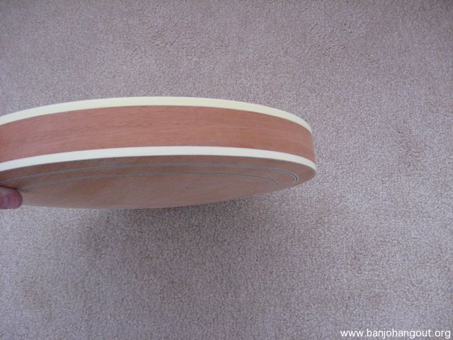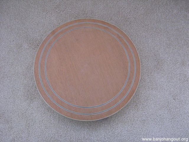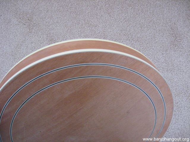 The matching Gill mahogany resonator is bound in ivoroid with ivoroid/black/ivoroid concentric rings. The binding has been scrapped and the resonator is ready for final sanding/finishing. The neck slot is cut. Holes for the wall lugs have not been drilled.
