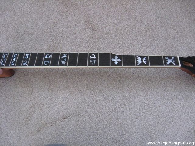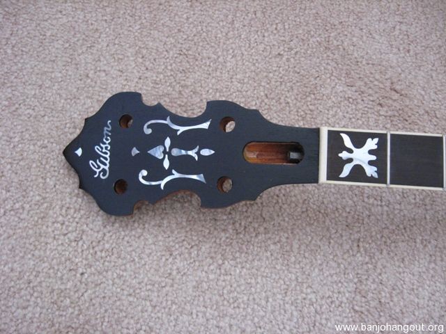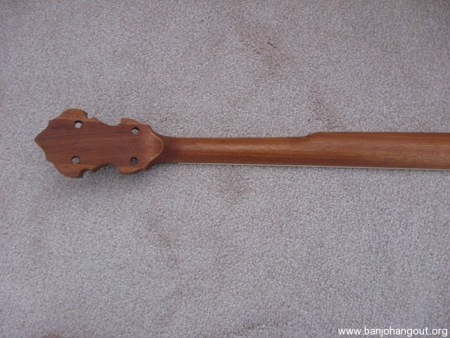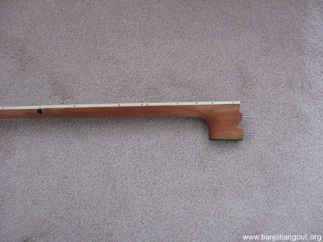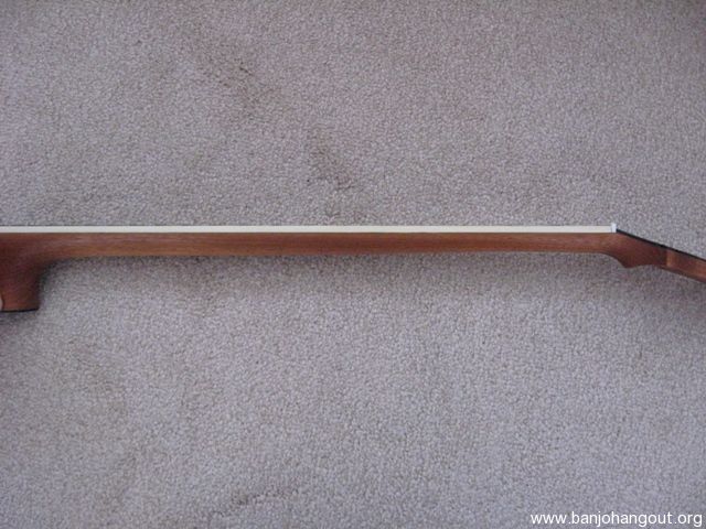 This Neck and resonator combo was being built for a Gibson pot assembly but I decided to go another route. The mahogany neck is ready for final finishing with a wash coat of nitro already applied. It started life as a First Quality CNC neck. Ebony fingerboard bound in ivoroid. The heel is cut for a one piece flange and the lags installed. The hole for the 5th string nut is drilled.