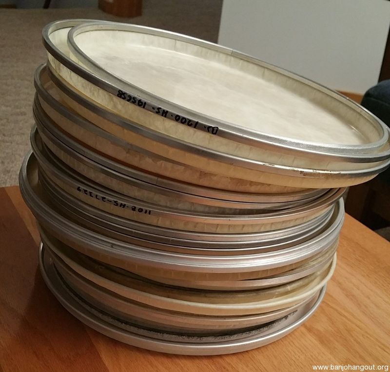 Cleaning house in preparation to move. 24 used banjo heads. Most 12 or 11 inches. 6 Renaissance, 5 top frosted including a Deering and a 5 Star.