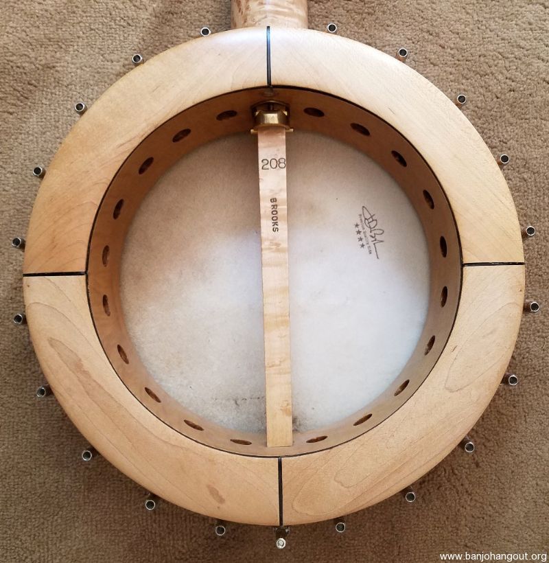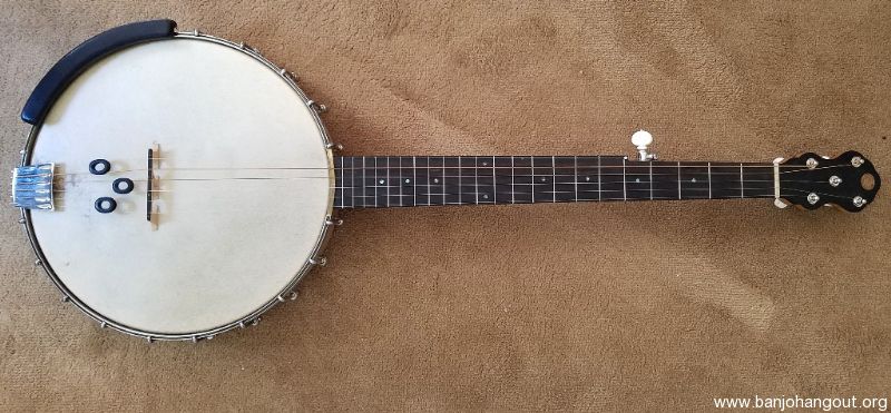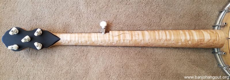 12 in. Yosco pot from 1920's with added tone hoop from Ray Alden designed 5 string. Internal resonator. Custom neck by Brooks Masten. Beautiful one piece maple neck half curly and half birds eye.