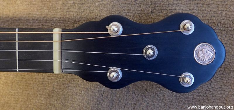 Carved behind the 5th. string peg. 25 1/2 in. scale. Heavy ebony fret board with small abalone dots and pearl side dots. Ebony peg head veneer with inlayed 1905 Indian head penny. Ebony veneer on