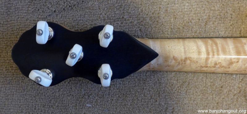 the back of the peg head. Banjo mate slimline arm rest. Romero 6 string tail piece. Balch 4 star skin head. Hard shell case.
