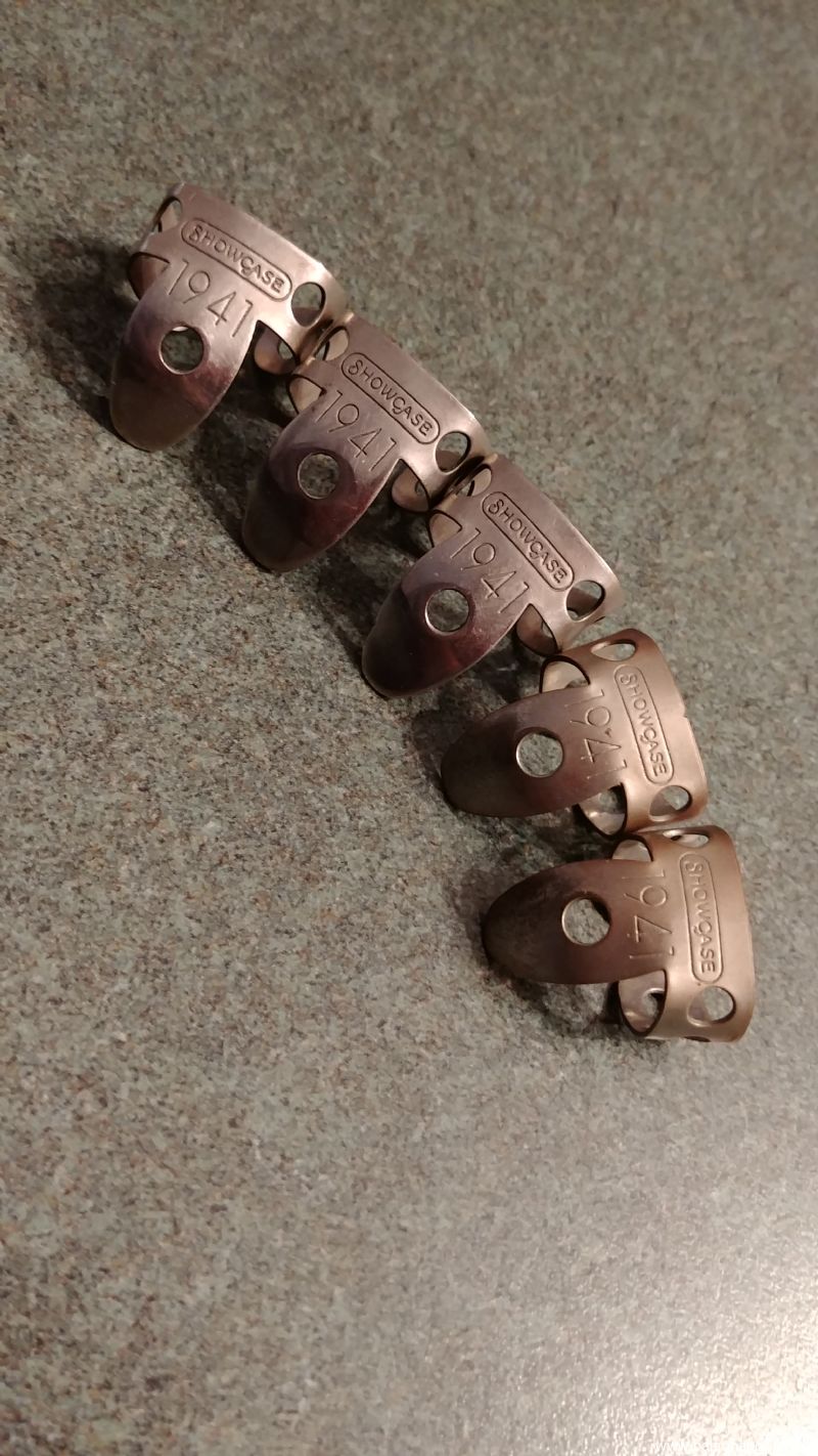 Five Showcase 41fingerpicks, probably some of the first 41's ever marketed, as I recall. Two show some use, the other three, not much, if any.