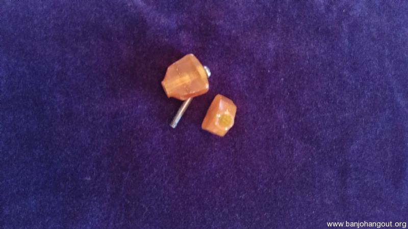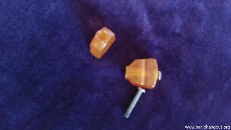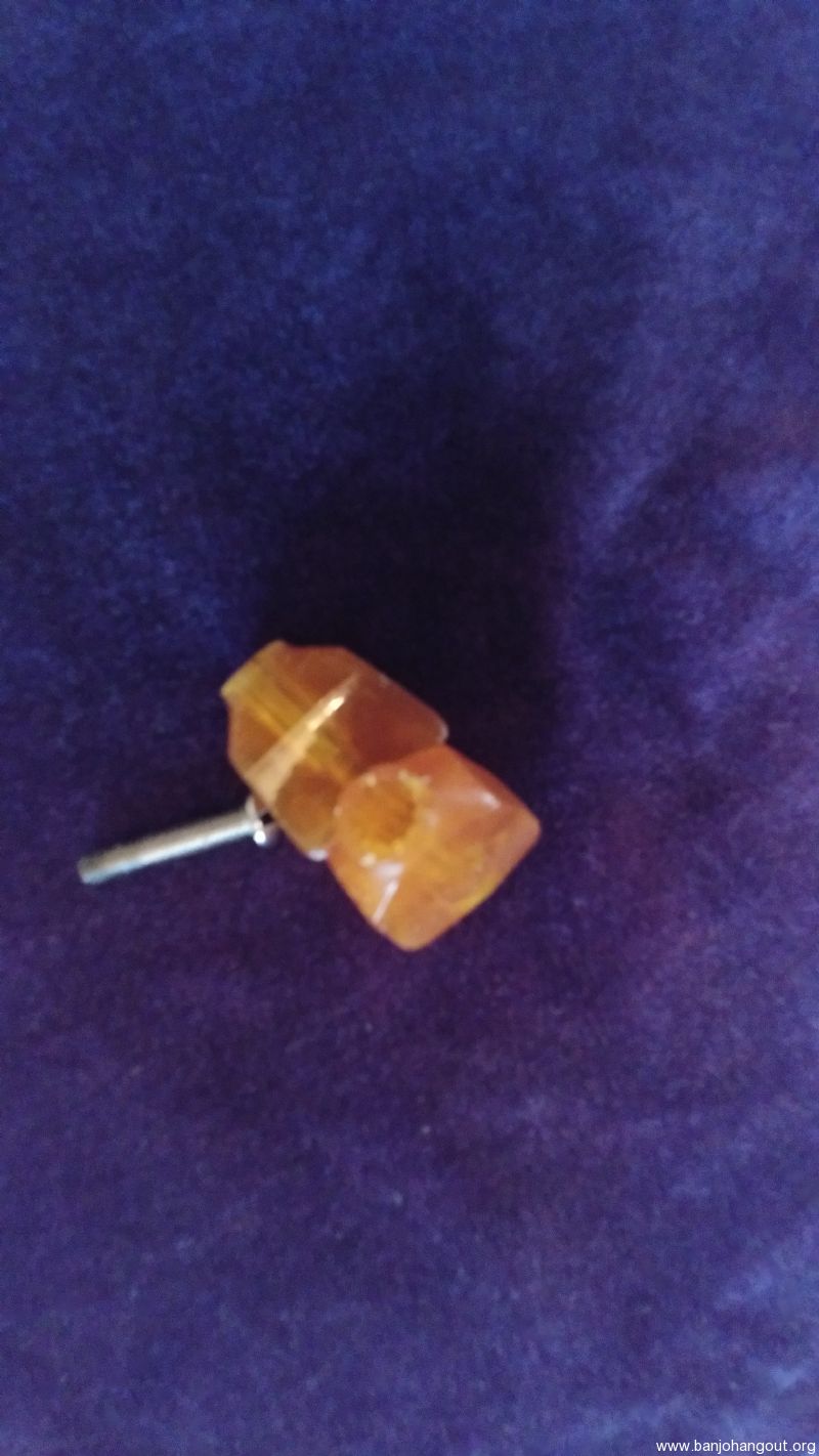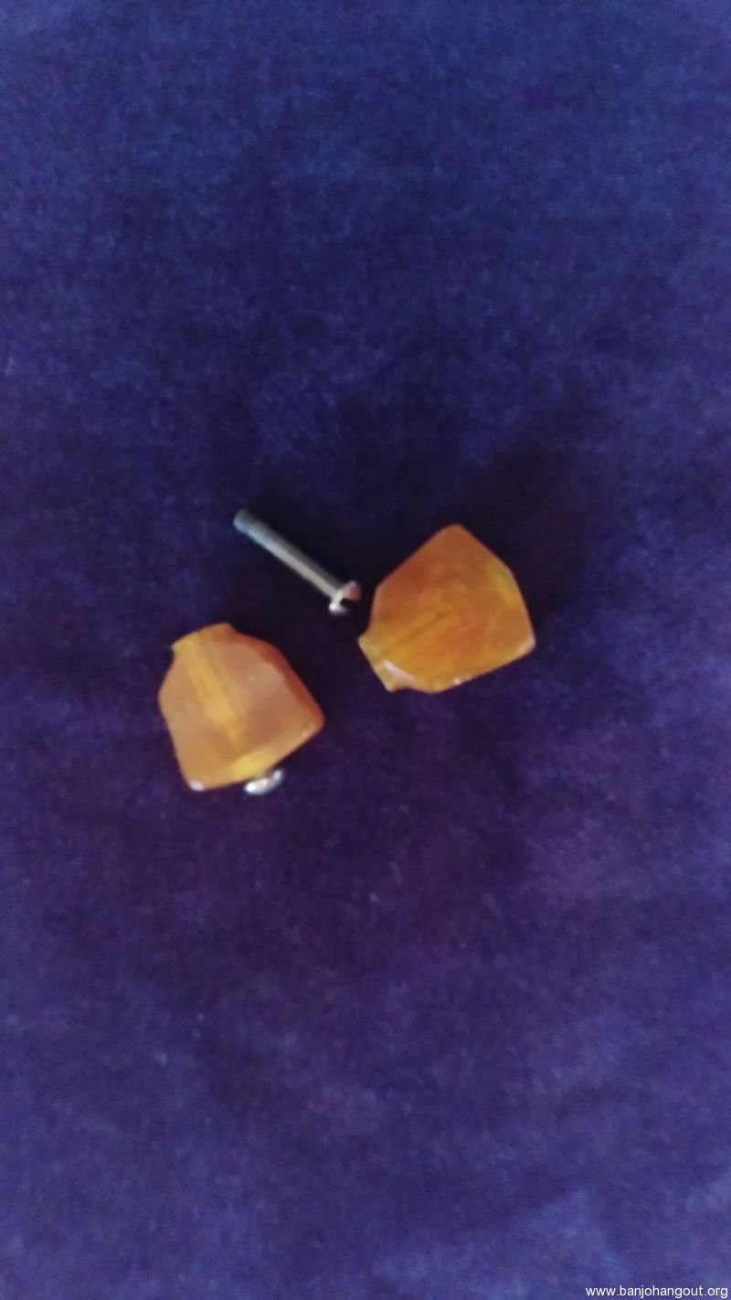 Keith tuner buttons by Ron Barnes. Tulip shaped, dark amber to butterscotch color. Screws compatible with Keith shafts.