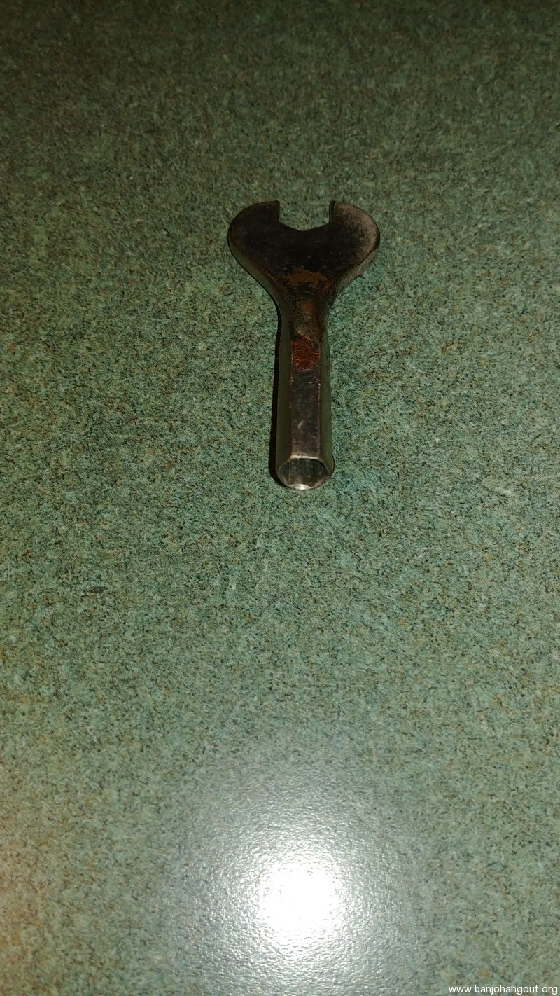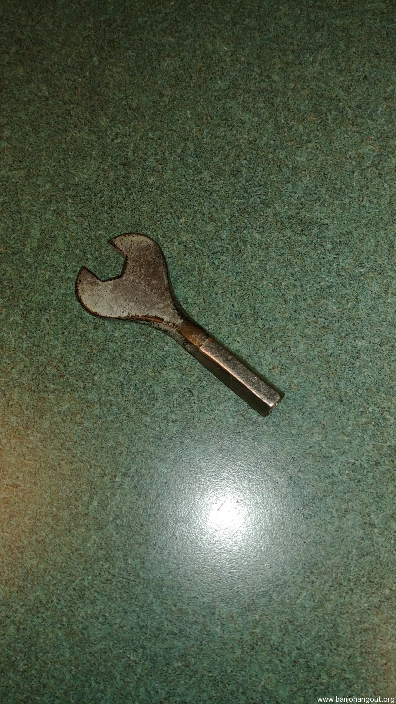 Prewar wrench, that likely came with a Gibson banjo as a standard, included accessory. Fits prewar Gibson coordinator rod nuts and the