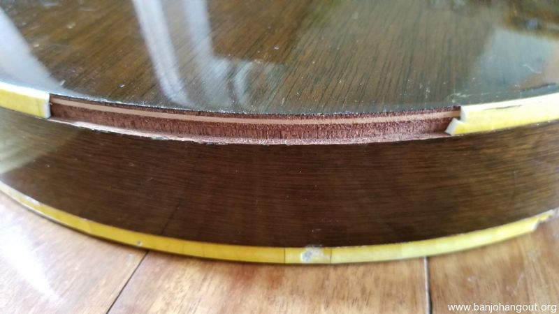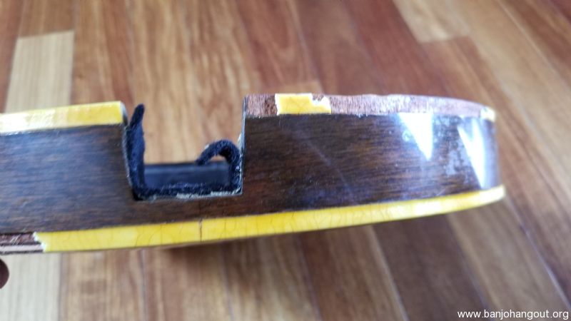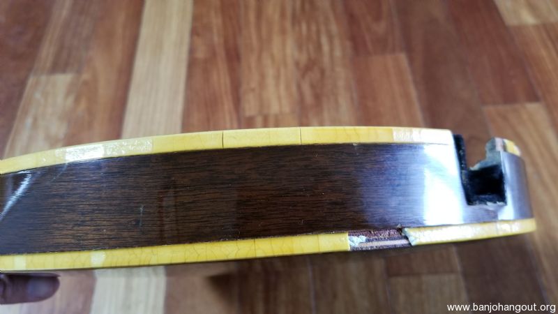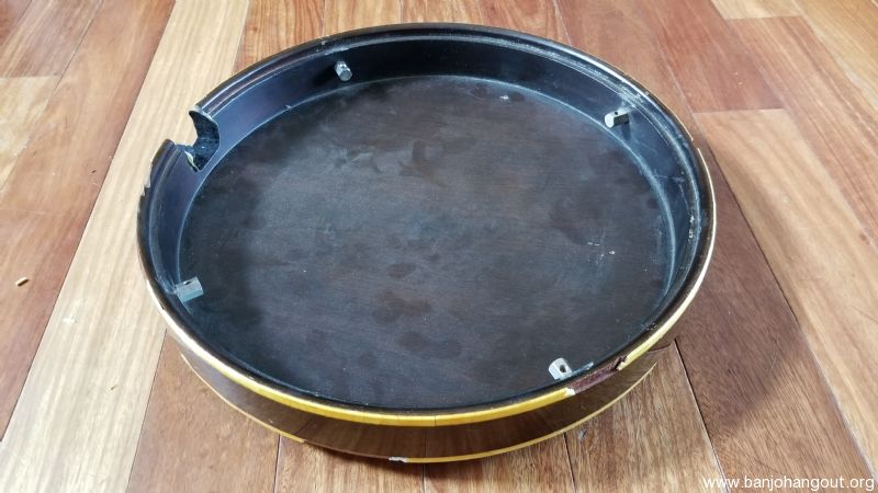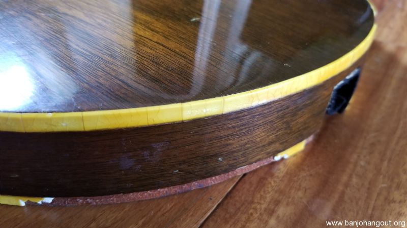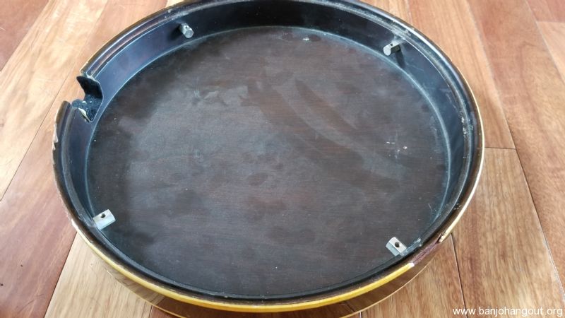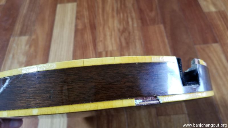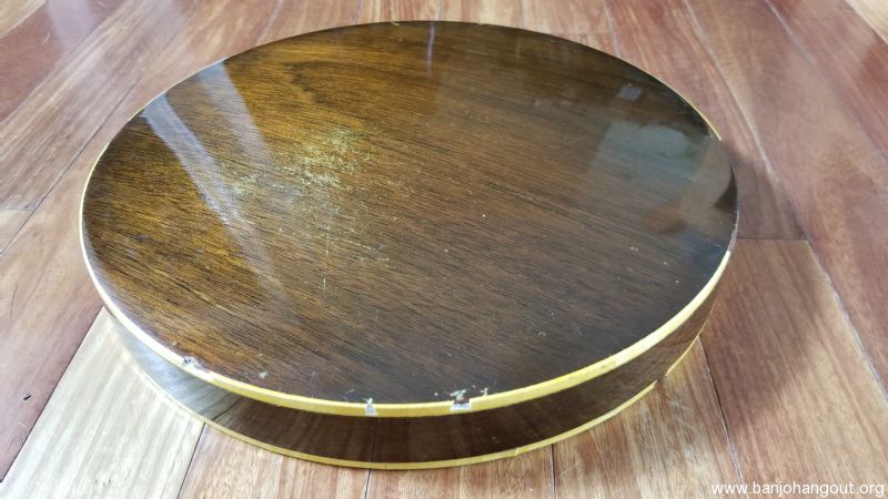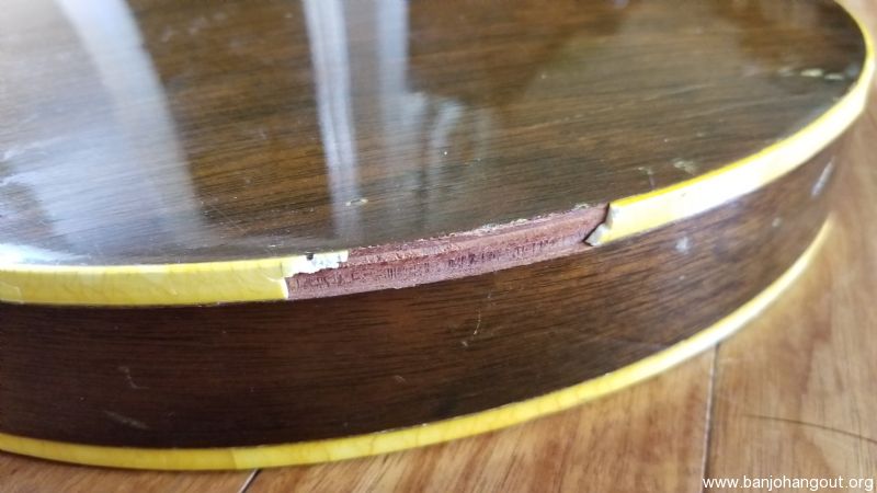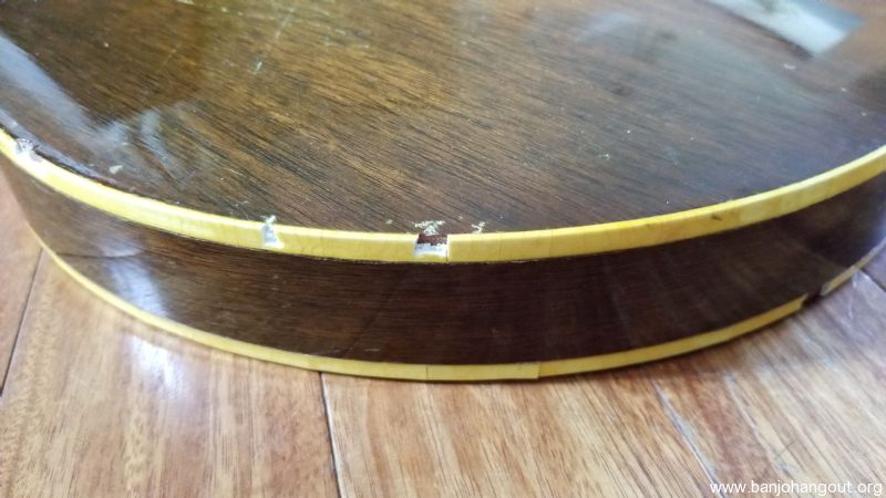 Mahogany resonator from early 1970's Gibson RB-250. Binding needs replacement, lots of gaps and flaking. Wood is in great shape. Some buckle rash on the back. Lugs still in place.