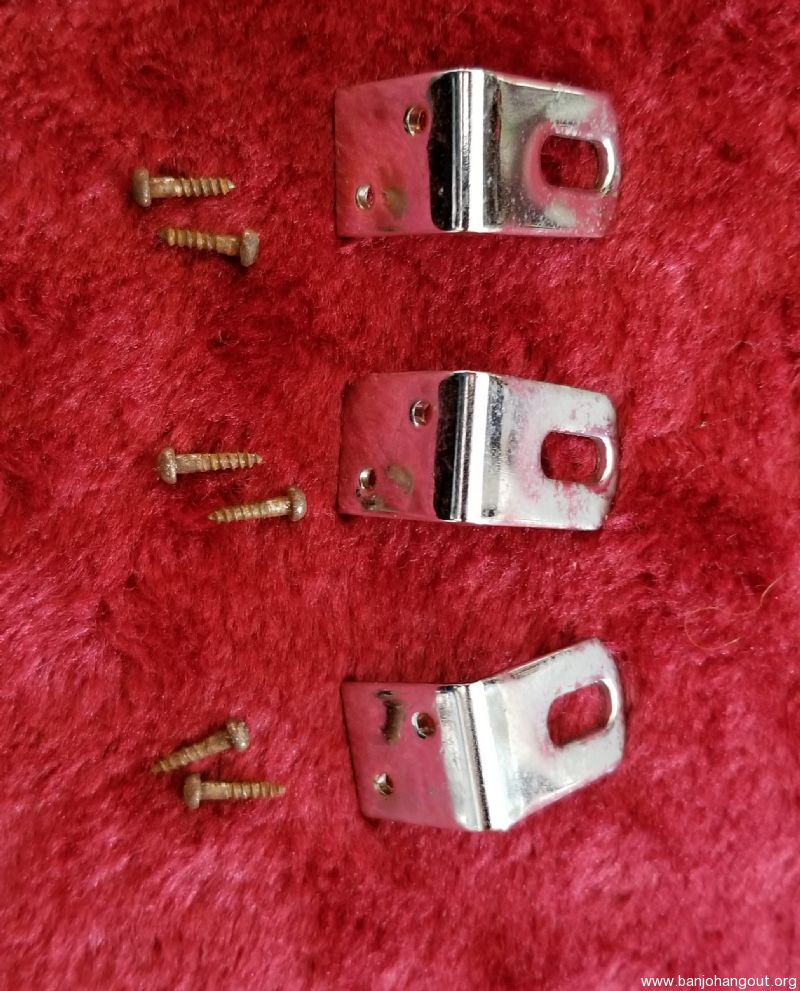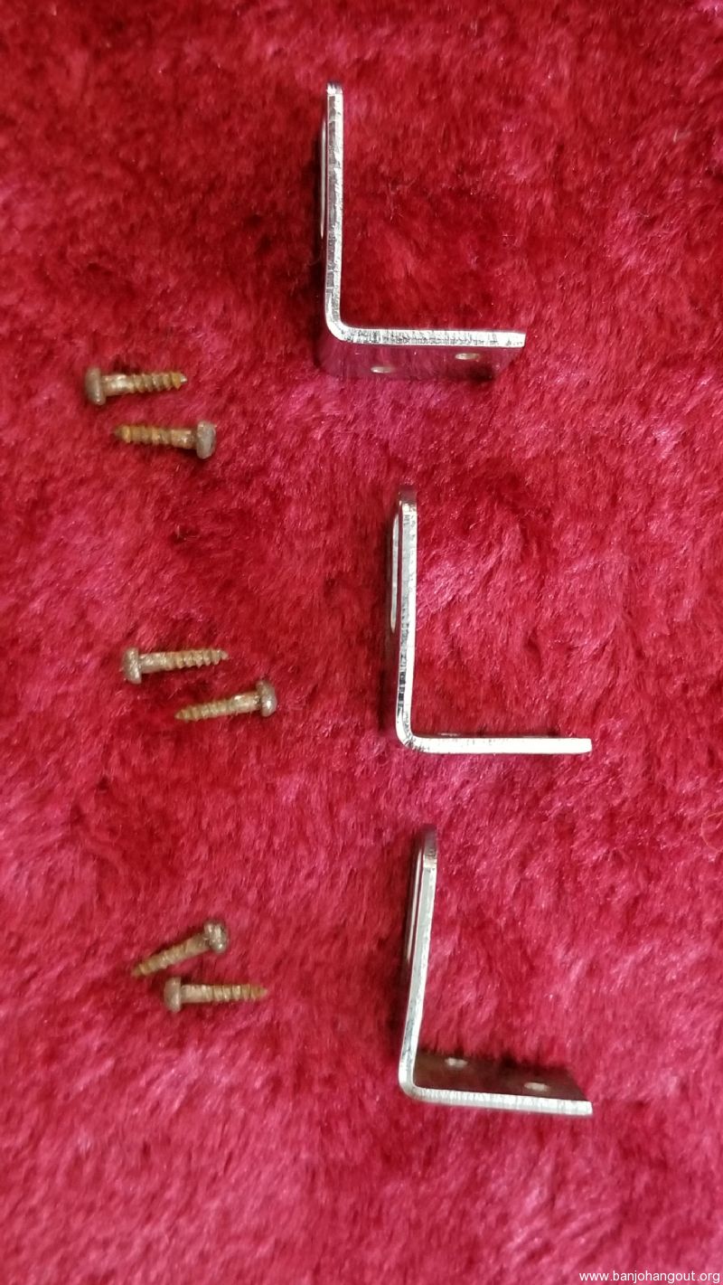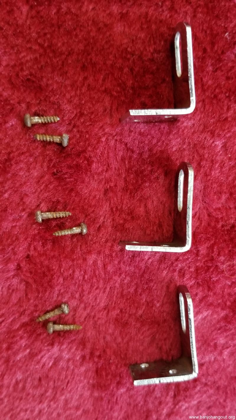 Set of 3 L-brackets and screws for Gibson banjo. Came off of a mid-1960's RB-100. Used for connecting the resonator.