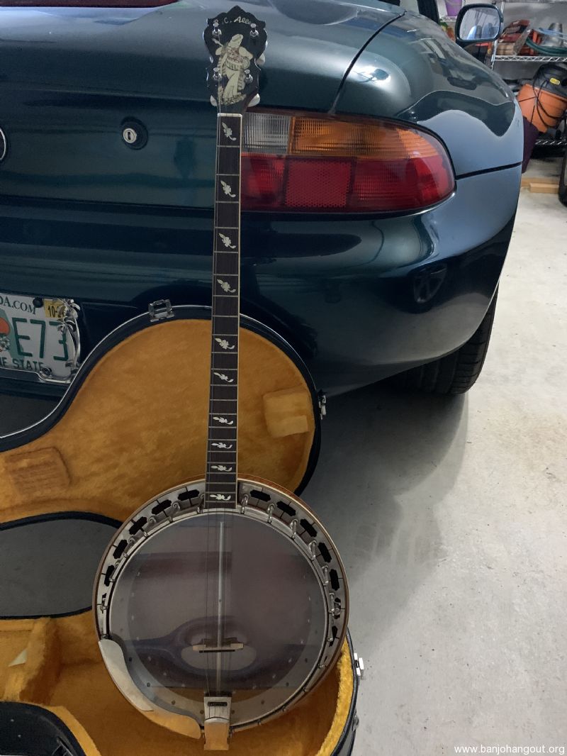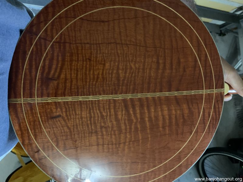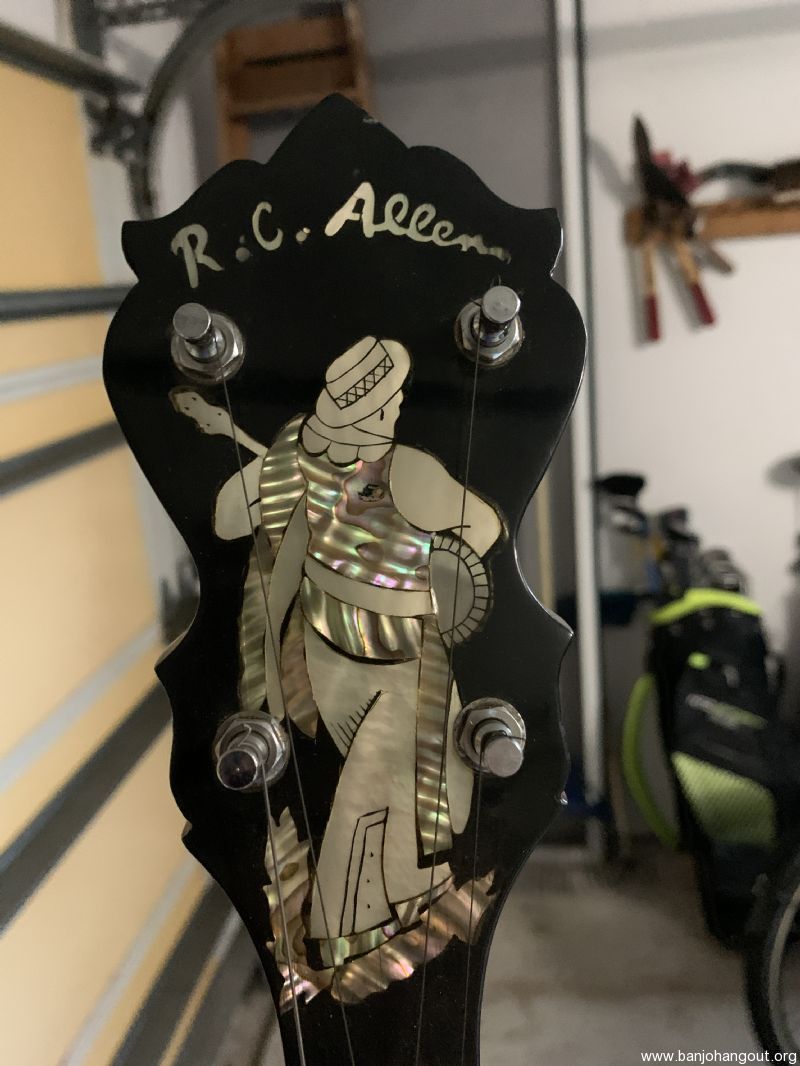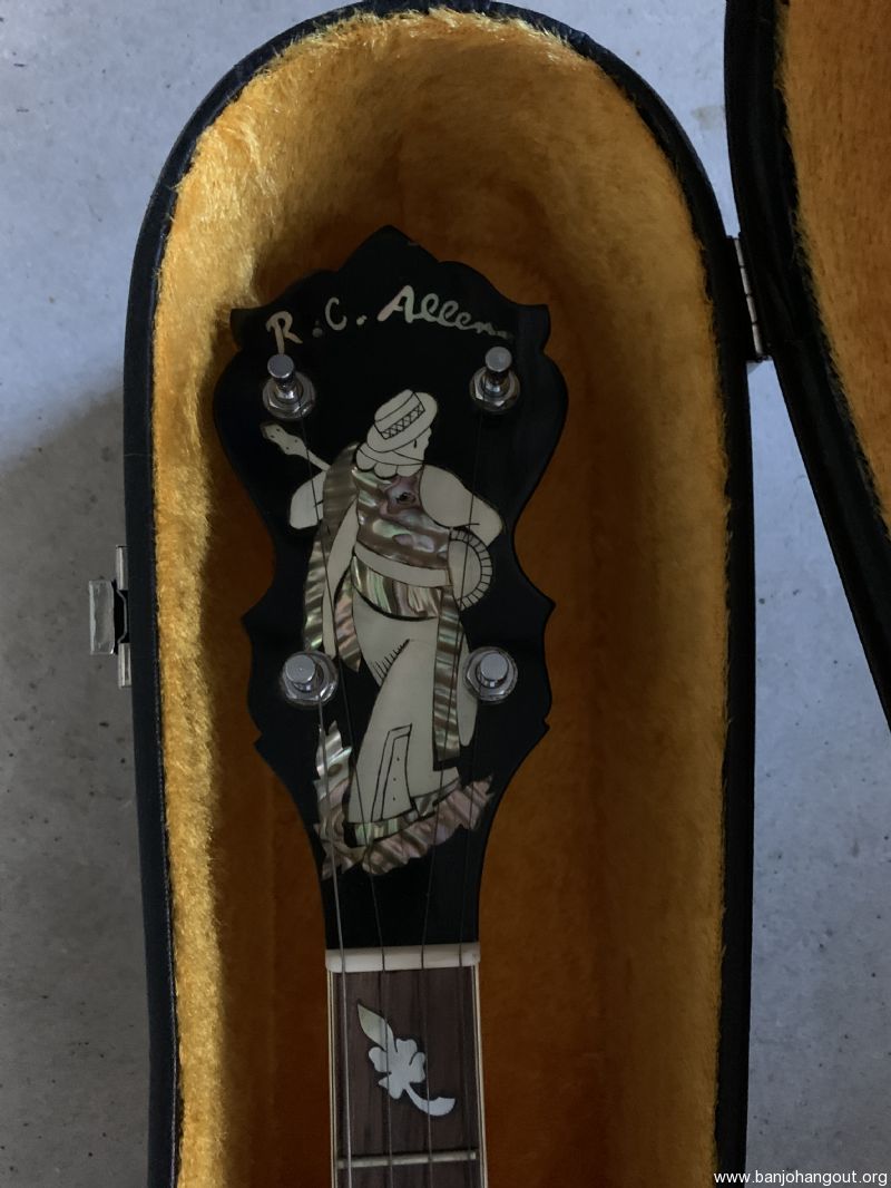 Beautiful, Very good condition RC Allen 22 fret Plectrum 4 string banjo. Straight neck. Custom cowboy headstock inlay. Looks like solid curly walnut resonator. Sounds great. No appreciable fretwear. Looks mostly unplayed. Will ship insured for free with full price or close to full price sale.