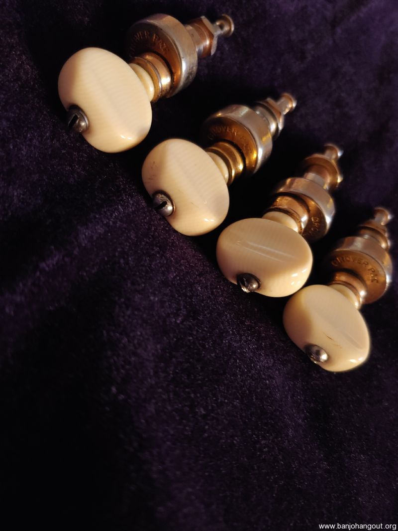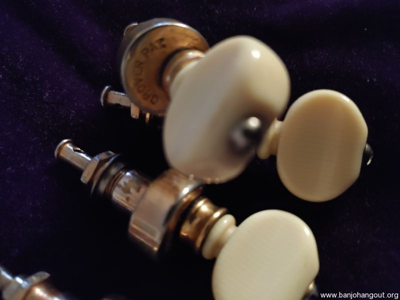 Grover Pat. Pancake style tuners, gold plated. Gold plating has some wear from being several decades old, but still in very good cosmetic condition considering the age. The tuner buttons are not original. Removed from a perfectly working and tunable banjo.