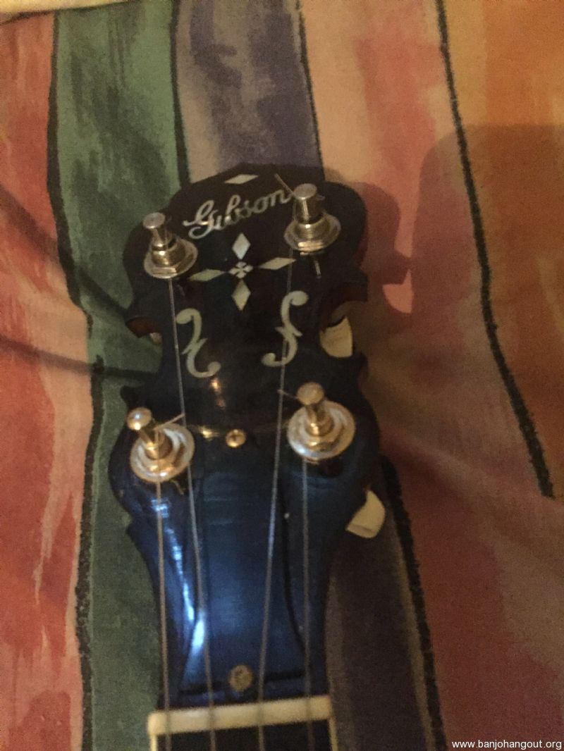 The neck is a 2004 Gibson RB-250 OPF configuration, with a fiddle headstock and Waverly/Five Star/Keith tuners.