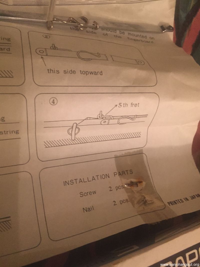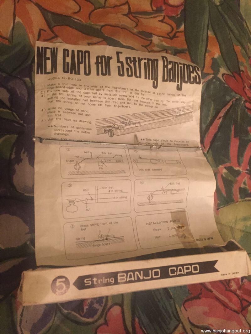New old stock Japanese fifth string capo with included screws and nails.