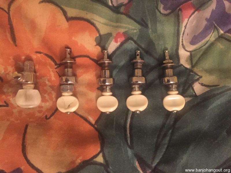 Set of four offset banjo tuners from a 1965 Gibson TB-100, and a geared fifth string tuner.