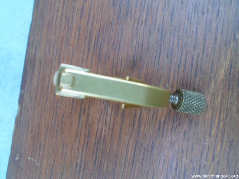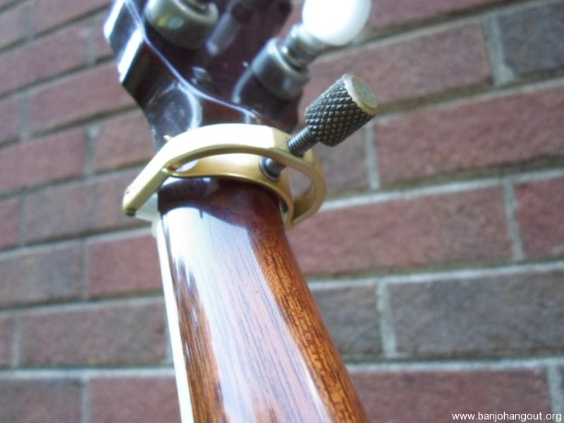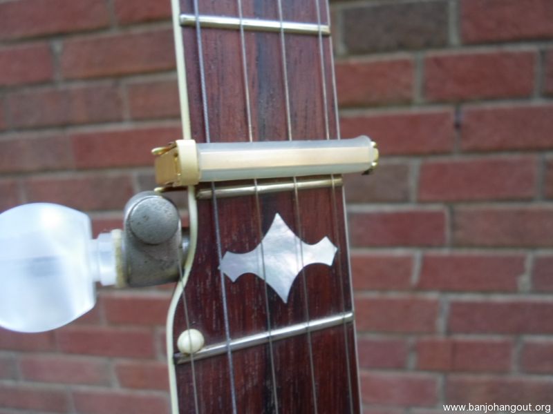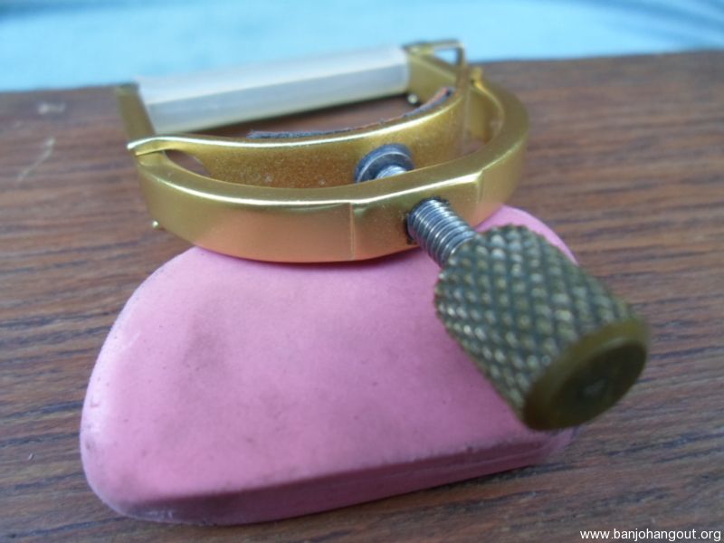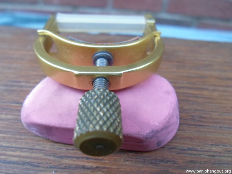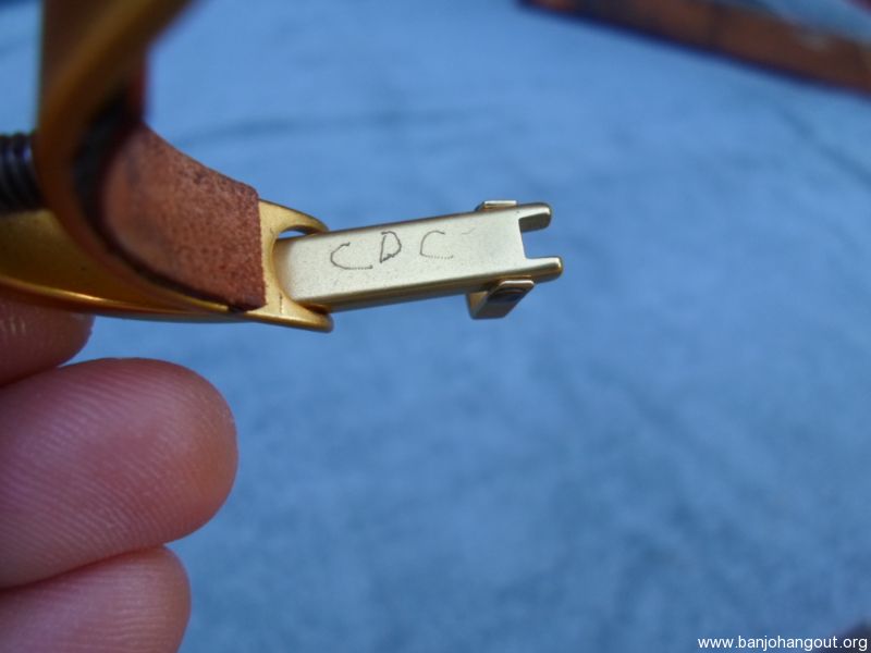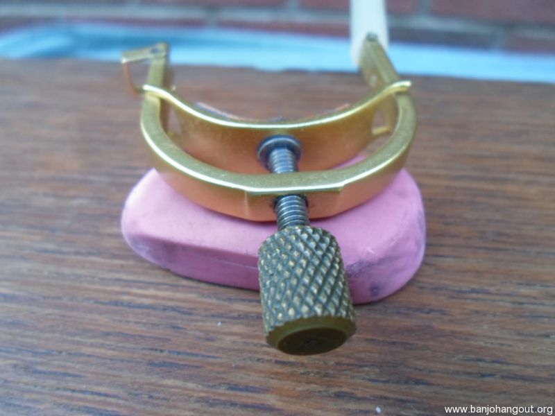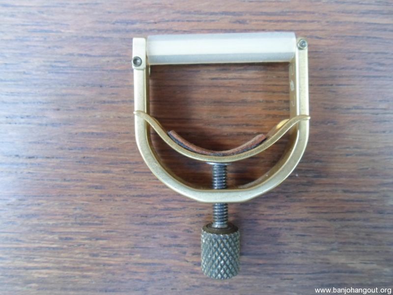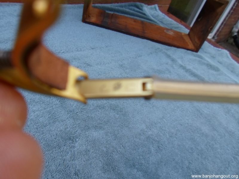 This is original and has had light use; all mechanics work well, and it has the original leather pad. I changed the original string cushion to the stock Huber capo surgical tubing as I thought it was superior. It works as intended with no issues. The surgical tubing has never been turned and there is not much wear on the used side. See pictures for condition and measurements. There are initials lightly engraved on both of the inside sides as pictured. I think these were only made in one size, but I can't remember for sure; it is similar to the Huber capo dimensions I have listed (you can check that listing to compare measurements). I have had it on several Huber, Gibson, and other similar "standard" pre-war size/dimension necks with no issues of fit. See the measurements and confirm that this will work for your purposes. This is for a flat fretboard, not a radius fretboard. I got this from Jim Triggs when he was at Gibson with Greg Rich in about 1991. Being aluminum, it is lighter than the stainless steel versions. The gold anodizing would go well with a gold plated banjo, and there is not much if any wear to the gold colored anodized finish (it is not gold plating).