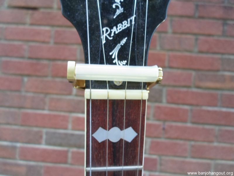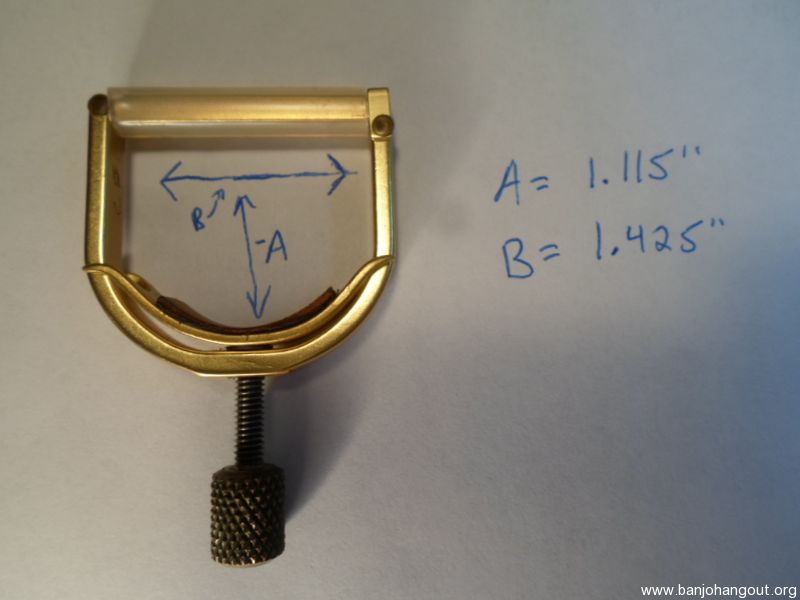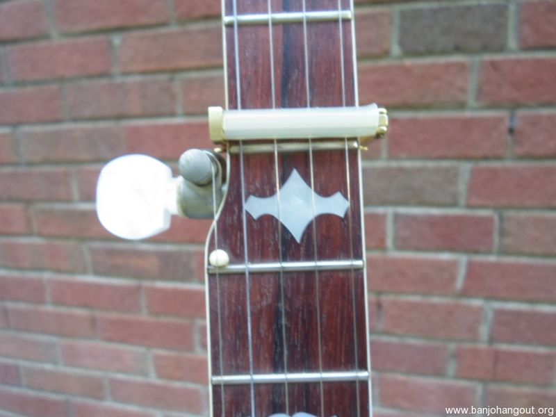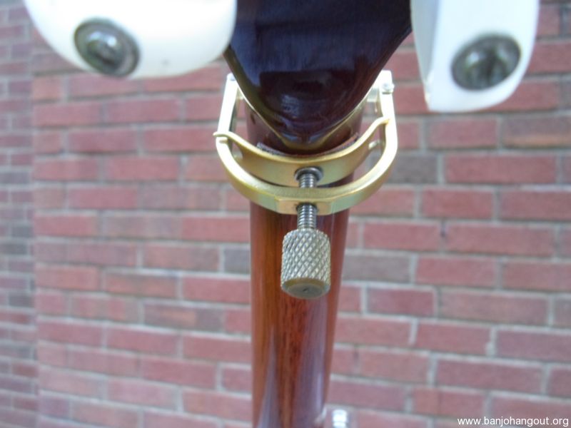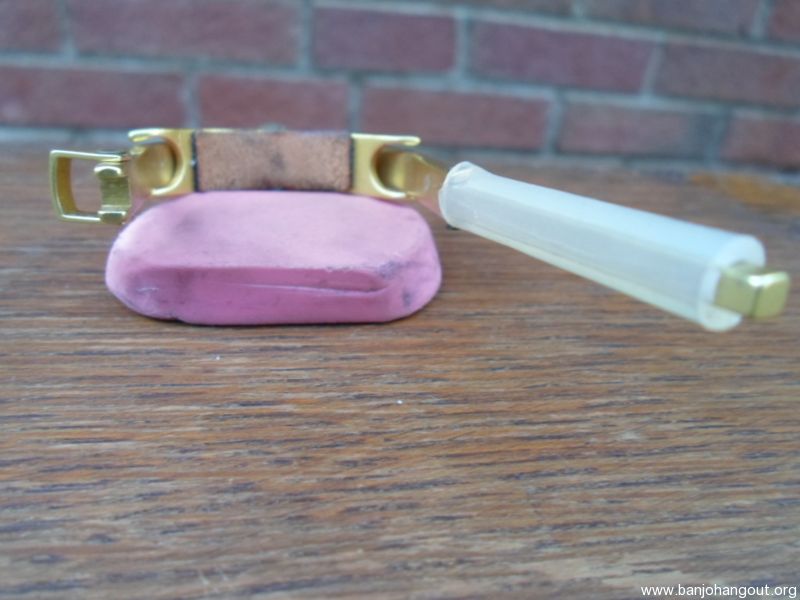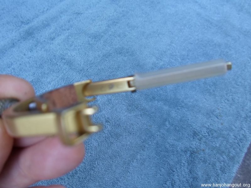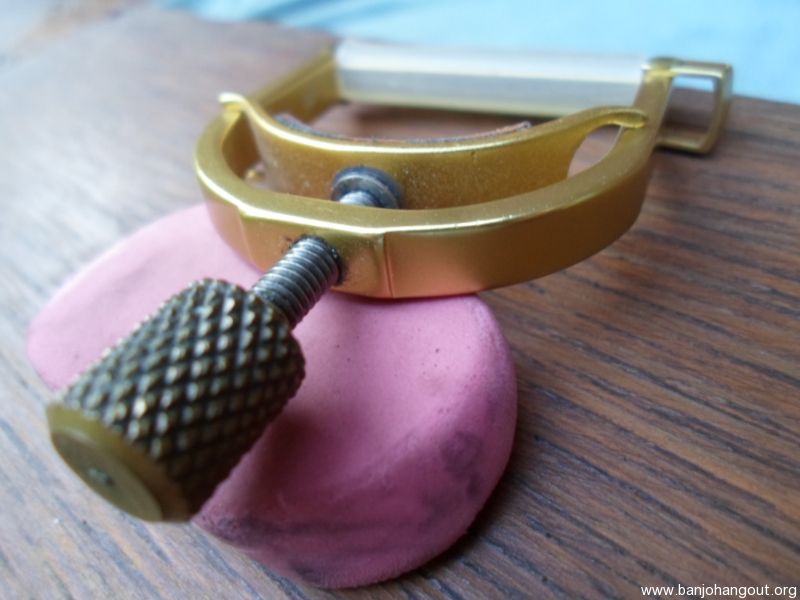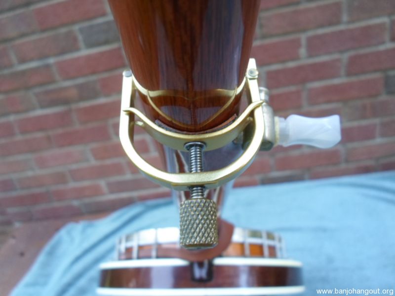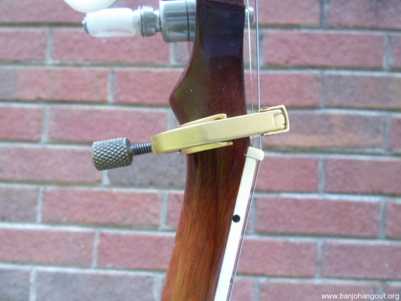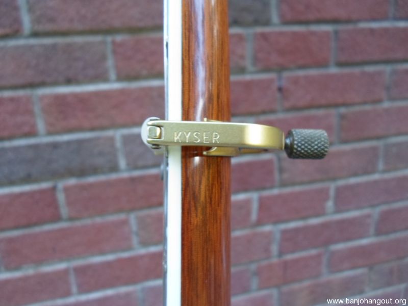 This is original and has had light use; all mechanics work well, and it has the original leather pad. I changed the original string cushion to the stock Huber capo surgical tubing as I thought it was superior. It works as intended with no issues. The surgical tubing has never been turned and there is not much wear on the used side. See pictures for condition and measurements. There are initials lightly engraved on both of the inside sides as pictured. I think these were only made in one size, but I can't remember for sure; it is similar to the Huber capo dimensions I have listed (you can check that listing to compare measurements). I have had it on several Huber, Gibson, and other similar "standard" pre-war size/dimension necks with no issues of fit. See the measurements and confirm that this will work for your purposes. This is for a flat fretboard, not a radius fretboard. I got this from Jim Triggs when he was at Gibson with Greg Rich in about 1991. Being aluminum, it is lighter than the stainless steel versions. The gold anodizing would go well with a gold plated banjo, and there is not much if any wear to the gold colored anodized finish (it is not gold plating).