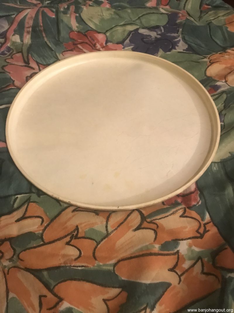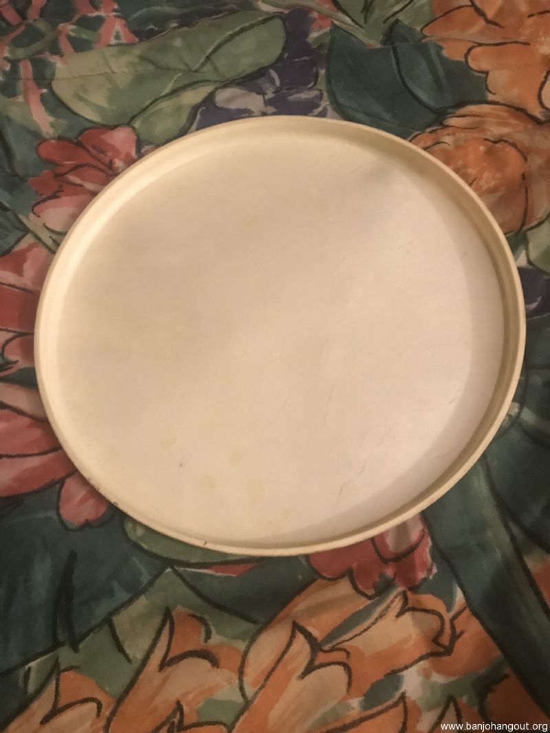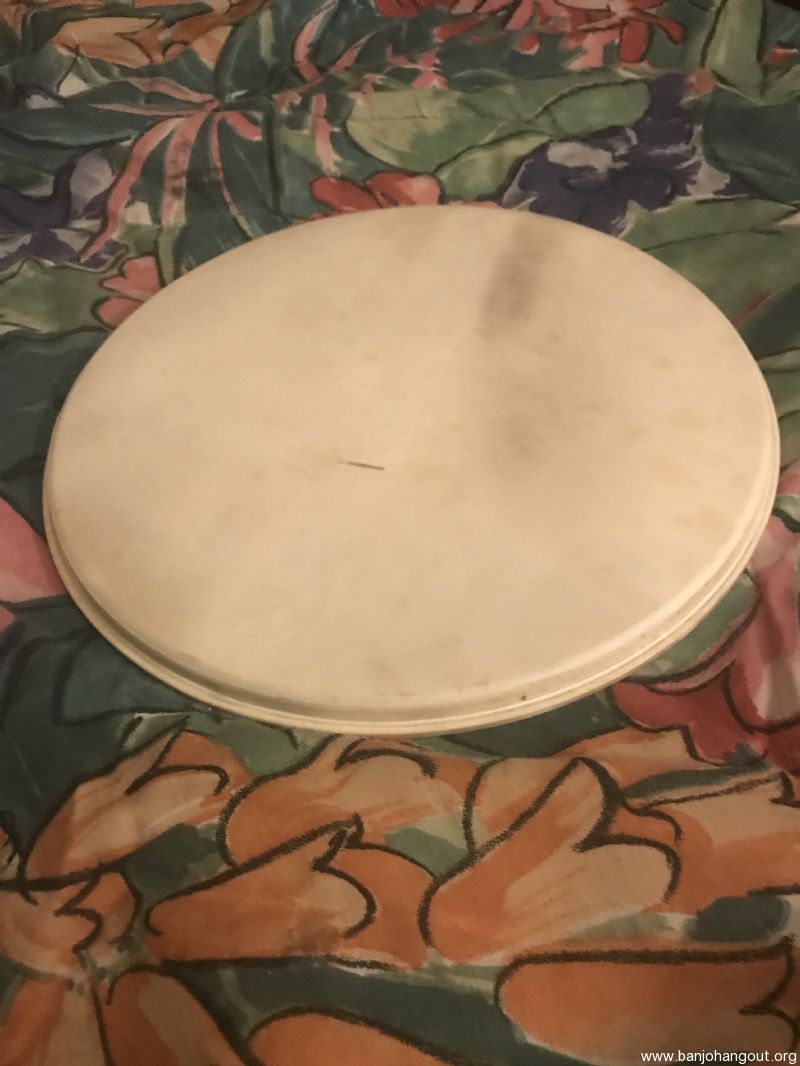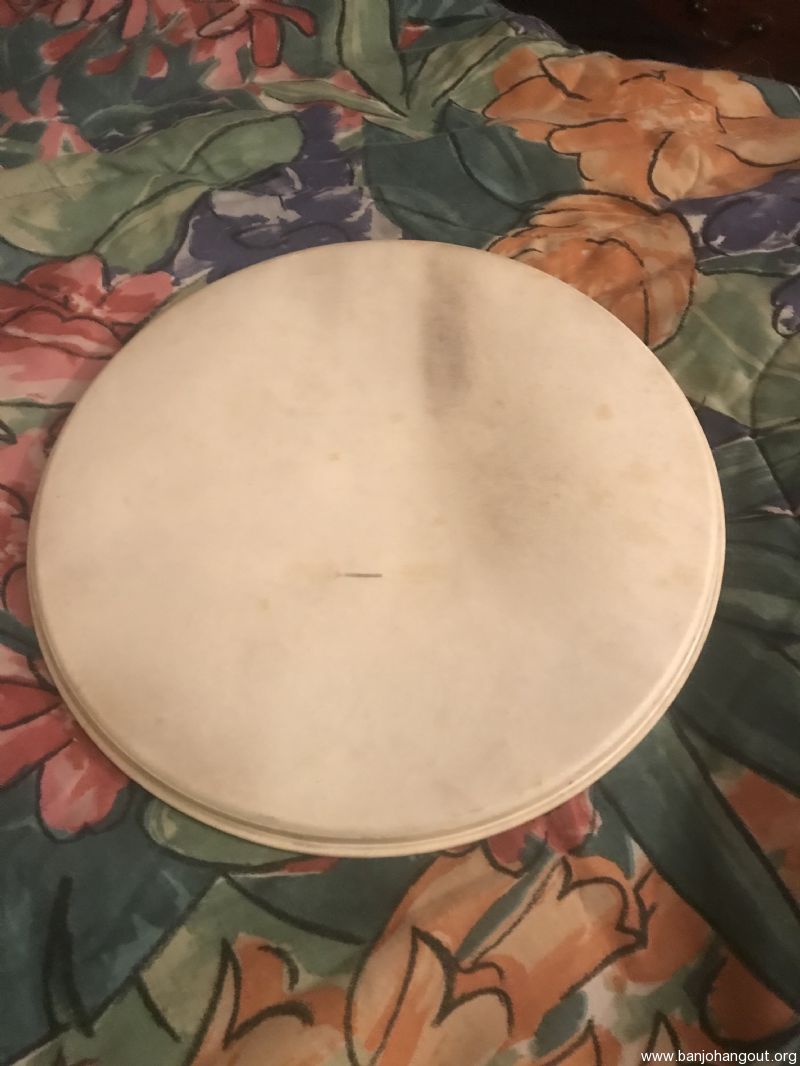 For sale or trade is a medium crown, 11” diameter calfskin head off of a Kalamazoo tenor banjo.