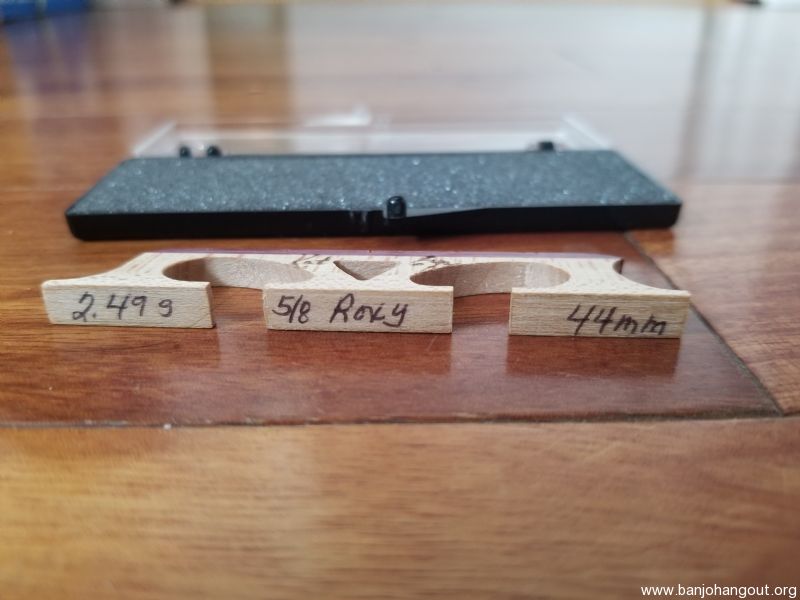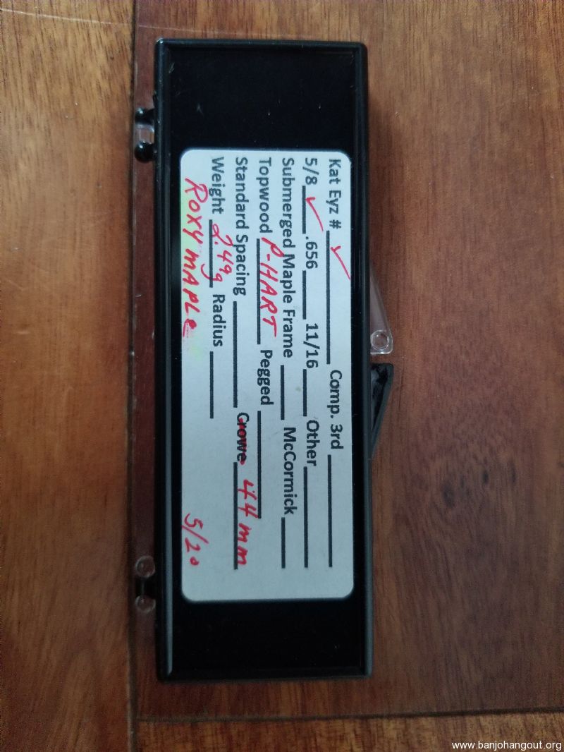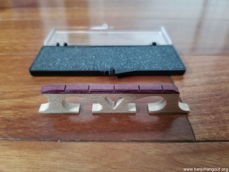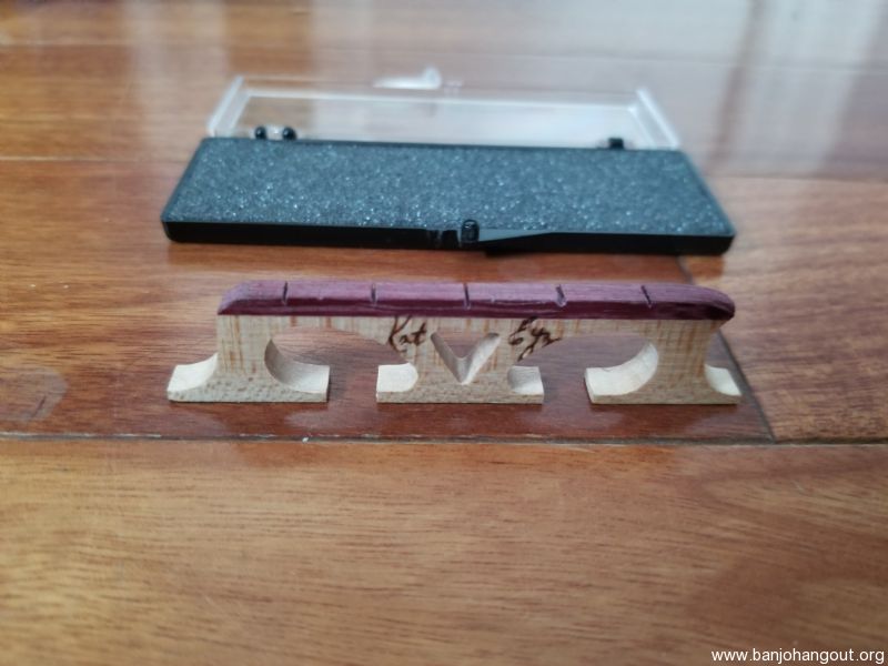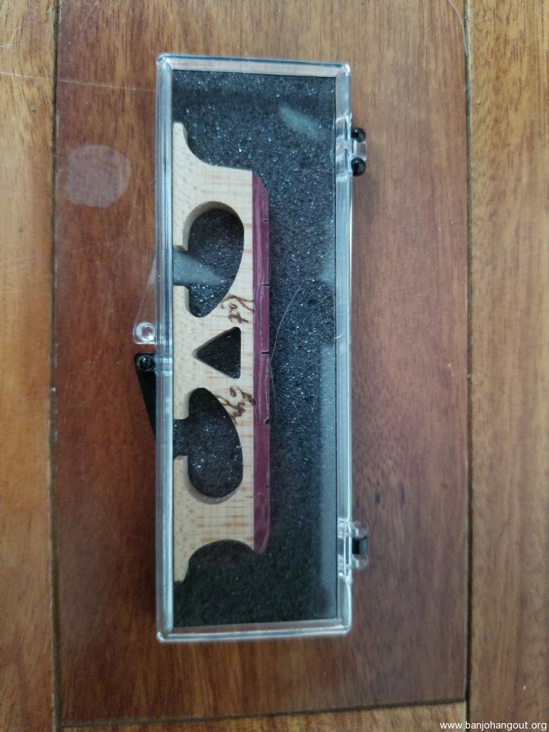 Never installed Kat Eyz Banjo Bridge. 5/8", Purple Hart top wood.