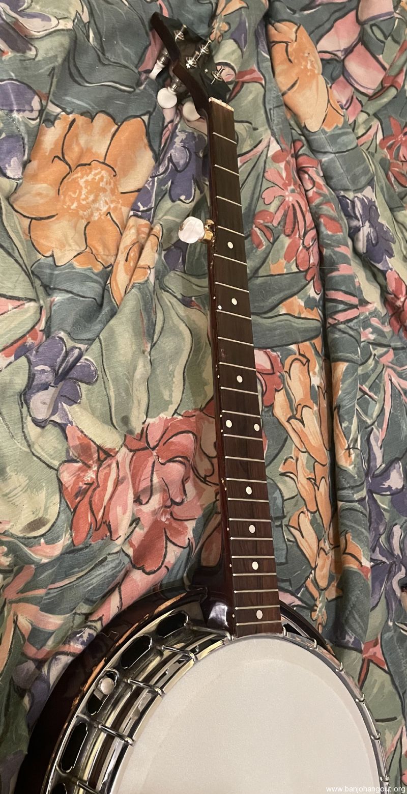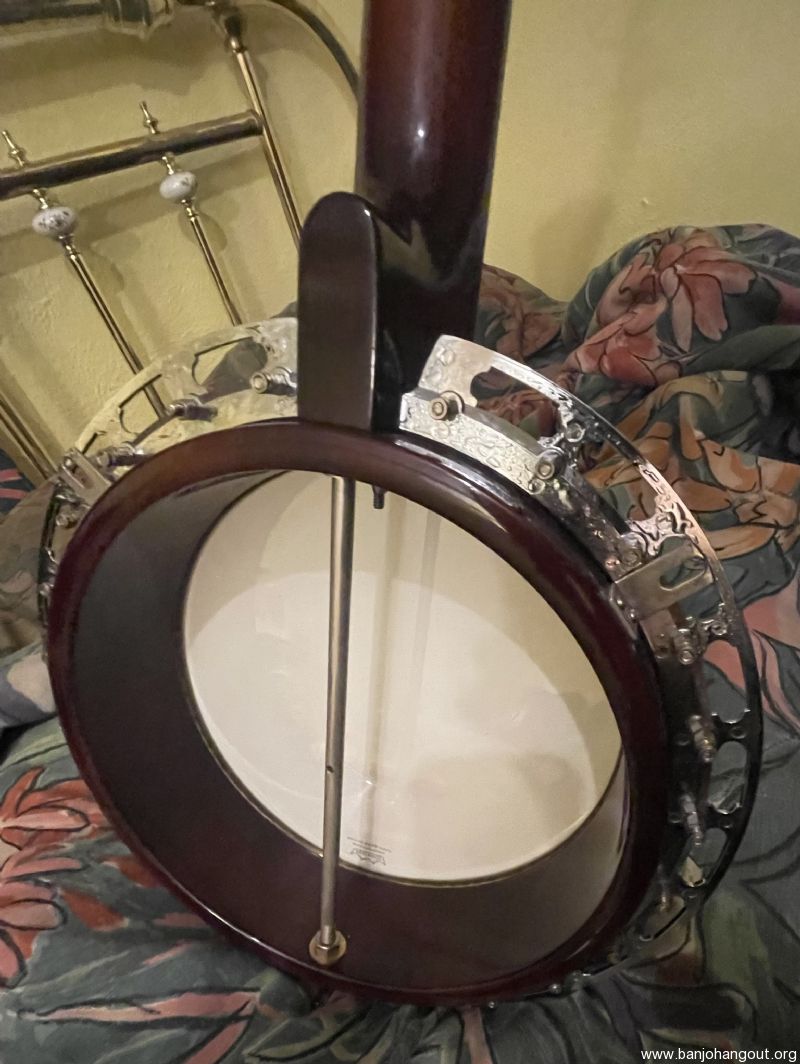 The banjo IS currently strung up with a mahogany bridge, and sounds fantastic. It's got more of an archtop snap to it, which I like better than the flathead sound.