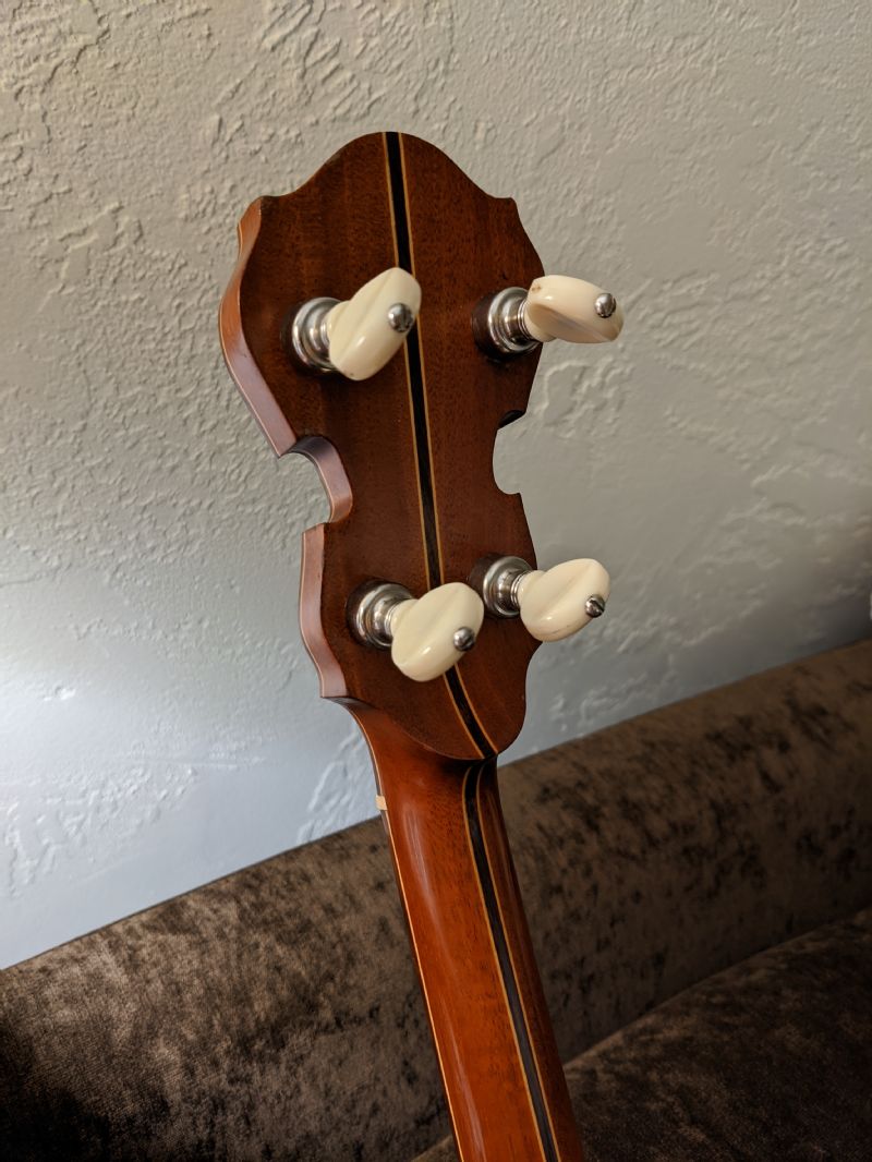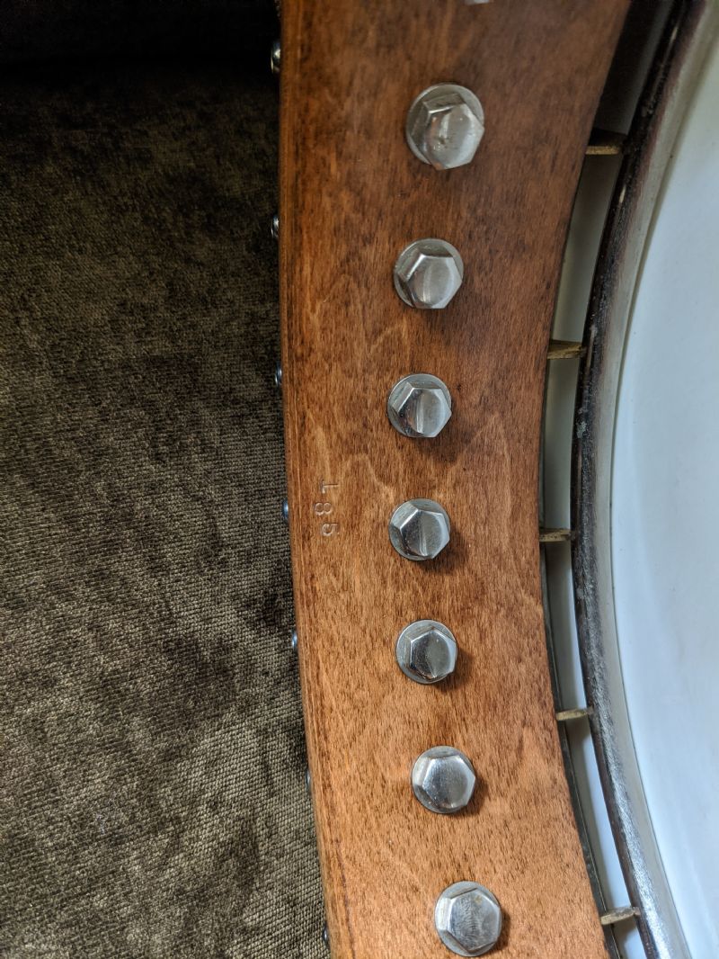 The other banjo is a Grade 2 that once belonged to an old friend of mine. It came with an aluminum rim, but several years later, the owner contacted Kix Stewart, one of the owners of Stewart-MacDonald, and Kix made a wood rim that looks like yours. Kix used all the parts that came on the original rim on this banjo except for the tone ring, which was one of his flathead rings. Kix also re-mounted the original neck to the replacement rim using an Ode-style dowel stick.
