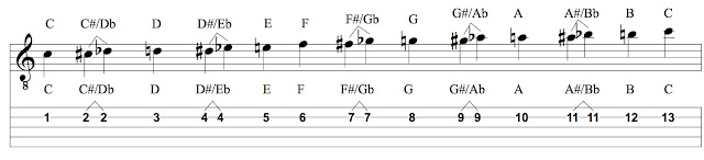 Let’s just get this out of the way right at the git-go just to make sure there’s no confusion. Here is what’s known as “the chromatic scale.” It is, in a sense, our musical alphabet: