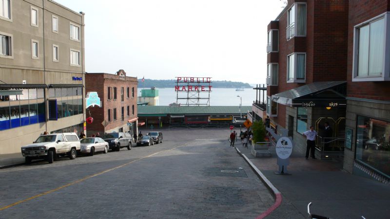 Okay, so I Photoshopped this one. I really like my new digital camera--it's a Panasonic Lumix DMC-LX2 (a 10 MP compact camera), with a big fat Leica lens and a widescreen format. Elliot Bay is in the background. I had fun on this trip, expert witness testimony and I got to stay in a swank hotel.