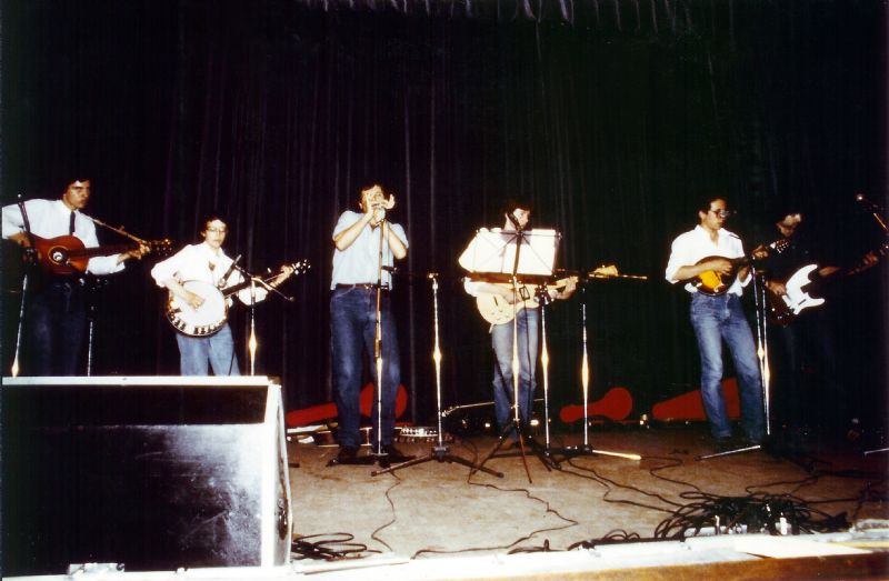 Although three of its original members were playing together since 1979, Crazy Banjo Band formed officially in 1980 but begun performing live only a year later. At first the group played rather naïve renditions of well-known bluegrass standards but soon refined their repertoire adding four-part harmony vocals, fiddle tunes arranged for dancing, and lately tried out original arrangements of popular country tunes with the addition of harmonica and electric guitar. The group toured a lot for a couple of years and faded out in the spring of 1983 when they met a record manager who offered them to cut a record. Following the departure of both co-founder guitarist and mandolinist, the band changed its name to Erbablu Style and signed with the record manager. L to R: Riccardo Frontini (guitar, vocals); myself (fiddle, 5-string banjo); Arturo D'Angelo (5-string banjo, guitar, harmonica, spoons, fiddlesticks, vocals); the late Stefano Galimberti (guitar, electric guitar, vocals); Luca De Pasquale (mandolin, vocals); Marco Feletti (electric bass).