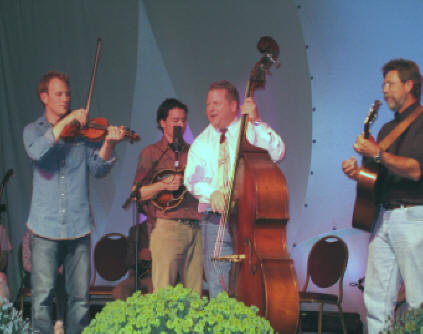 Mike Bub, Matt Combs, David Long and Me at the Olde Tyme Variety Show at IBMA in 2005. Photo by Linda Kattuah. Thanks, Linda, for your permission to use this photo.