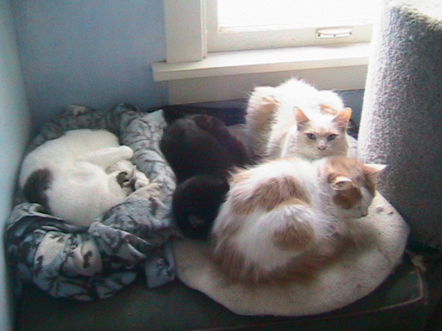 Boomer, Whiskers, Minnie and their mother Hootnany, a little ferrel cat that adopted me, (my four four footers) let me live with them too.
