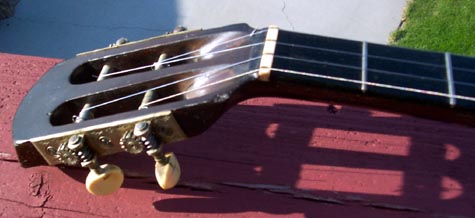 The peghead on this banjo is still rather steeply raked, but less so than the peghead on my other Silver Bell. Also, the peghead in general and the slots in particular are not quite as long and narrow as on the other banjo.