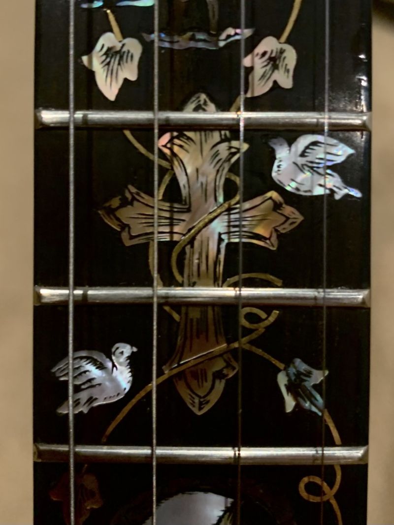 The 12th fret symbolizes the crucifixion. It shows the two vines converging on the cross where Jesus defeats death. In the new Jerusalem, there is only the tree of life. The tree of the knowledge of good and evil, which causes death, is no more. The 12th fret on the banjo is the half way spot between the neck and the body. When a harmonic is played there, the strings don't move even though there is sound. That silence seems fitting when we consider the meaning of Jesus' crucifixion.