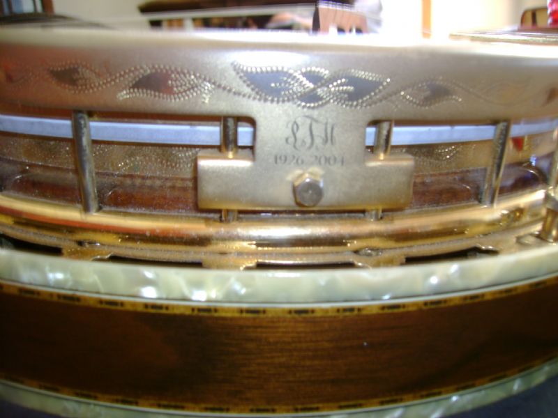I bought this banjo shortly after my granny died...I had the armrest engraved locally with her initials and years of birth and death...not the best pic..but I like it