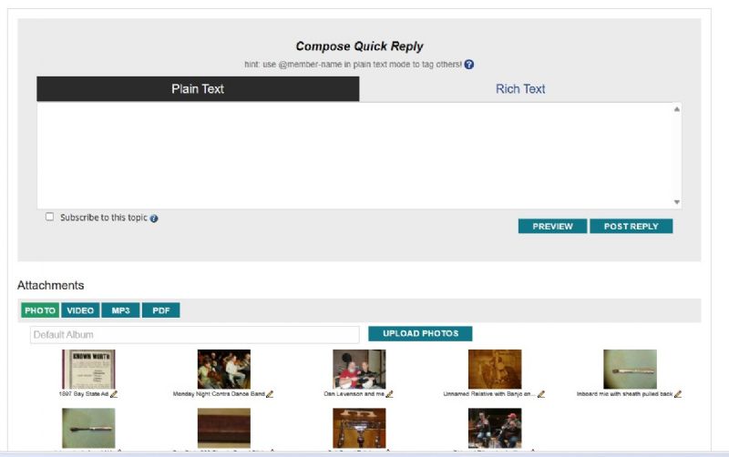 The Banjo Hangout myHangout photo albums were created to allow members to post photos which 1) they own the copyrights to, or 2) which are non-copyrighted. Please respect others by not posting their copyrighted images. Photos posted in violation of this notice may be removed by the webmaster without prior notice, and may result in a locking of your myHangout account. Read complete copyright policy.