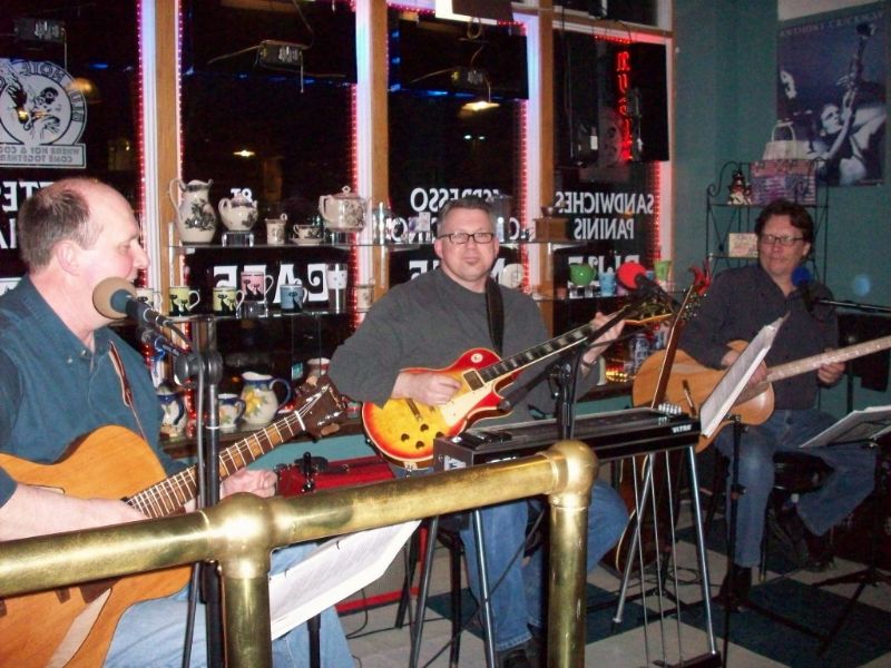 From Left to Right: Myself Greg Connor, Damon Kapke, Buck Erpestad. The crowd sipped, sang, and clapped along as we played at the Blue Note Cafe. Notice my guitar and Buck's Bass guitar, both made by Damon Kapke, the person in the middle holding a Les Paul Custom.