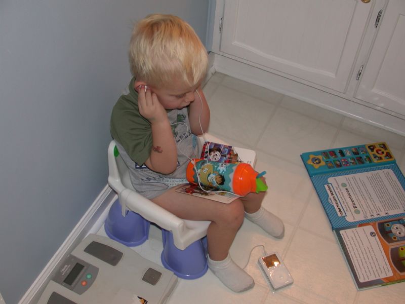 Glad I looked at the larger photo, Alan. In the smaller version, I thought he was covering his ears while Daddy practiced, but on enlarging it, I could readily see the ear buds to drown out the banjo. :-)