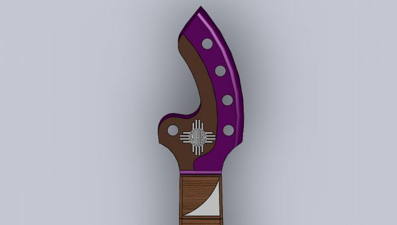 There'll be a tunneled 5th string that'll tune up on the left side, the rest will go to the right. The inlay is a zia with my initials, for when I worked as a backpacking guide out in New Mexico for a few years for the Scouts.