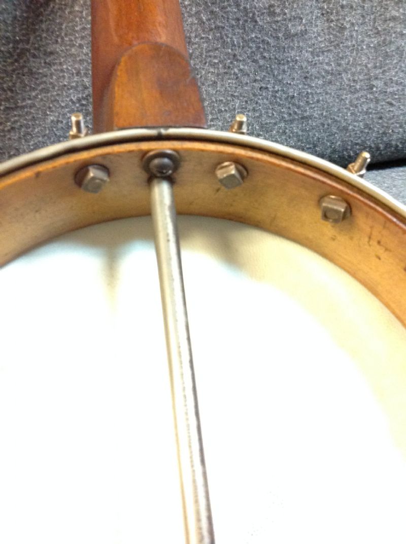 The 3/8" solid steel rod is threaded at one end and screwed into the heel of the neck. I know of three other Stewart banjos with metal dowel rods. Two are