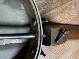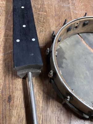 Originally posted by banjonzIt would be interesting to see the neck heel to see if the dowel stick has been removed. If so, it would be a later modification. I wonder how the rod has been anchored into the heel. Asian cheapy banjos have a single adjustable rod which is anchored to the neck with a wood screw through a hole in the base of the heel.