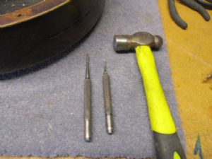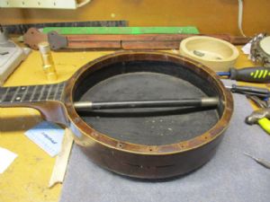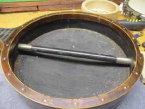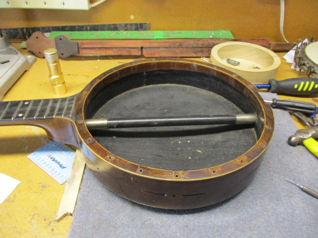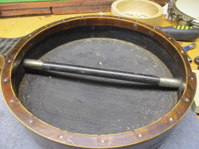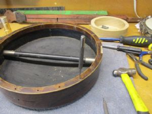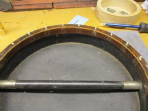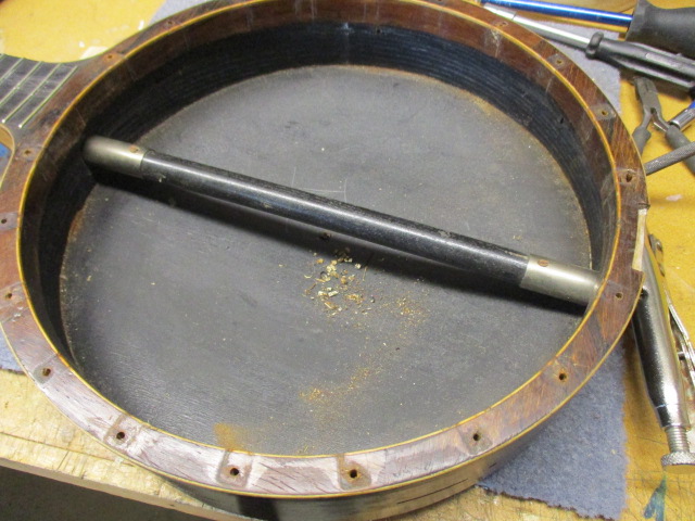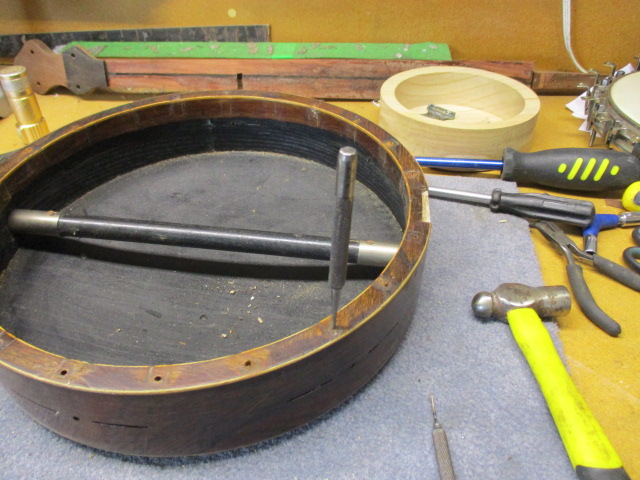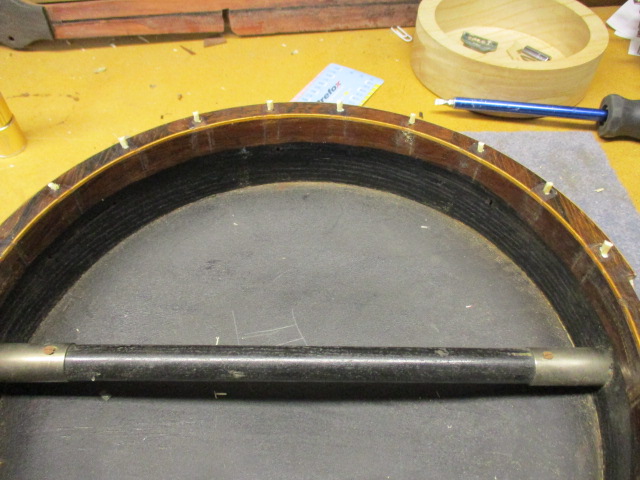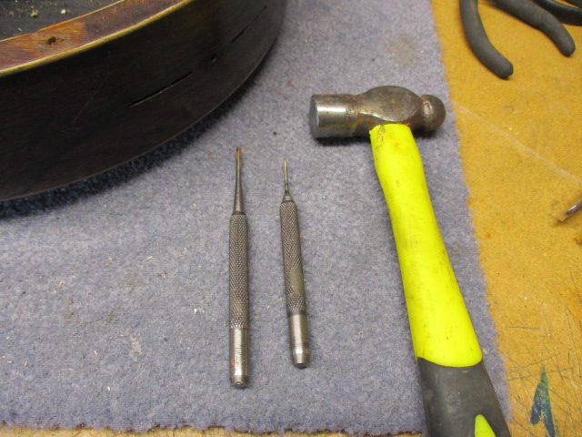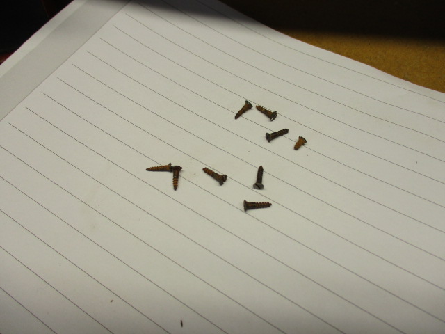 While attempting to remove the 'pot' assembly, a number of the screws managed to come out normally. Others did not. I decided to gently lever up the mounting brackets and in the process, some screws came up with the brackets and the rest broke off. They were pretty rusty. I decided to hammer the broken screws down into the rim using a 3/32” pin punch to make way for filling the holes, which I used standard matches with glue then cut off the excess with my Japanese saw and sanded everything smooth.