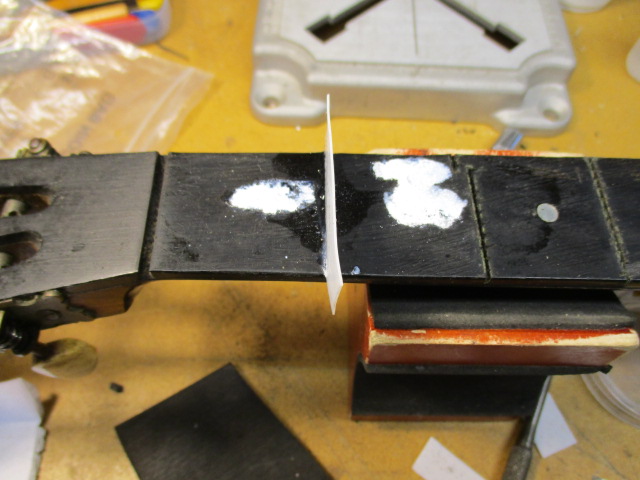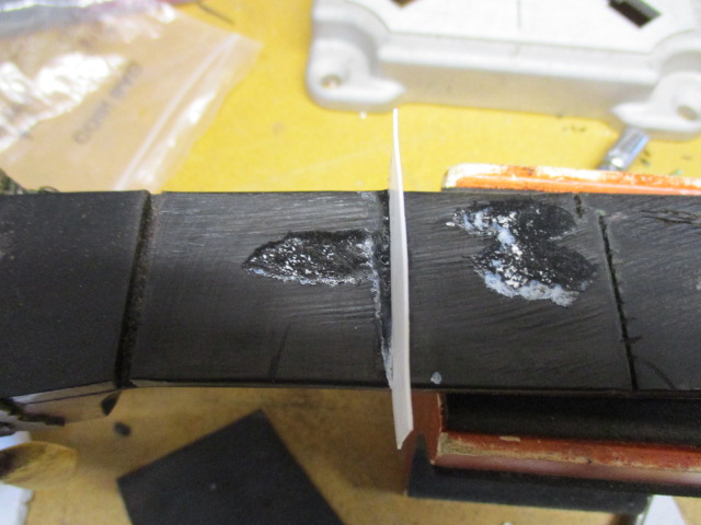 I commenced on the job of filling in divots using ebony dust and thin CA glue. I normally use Painter Magic activator here but it is becoming harder to get. I purchased locally a s-pray can of activator and below is the result. It went instantly white.