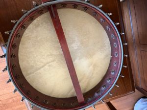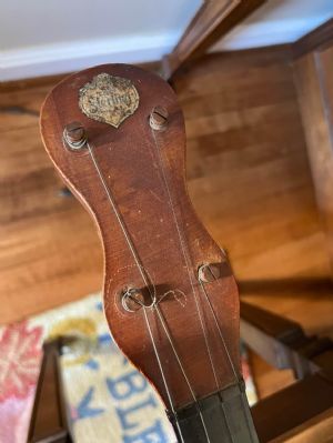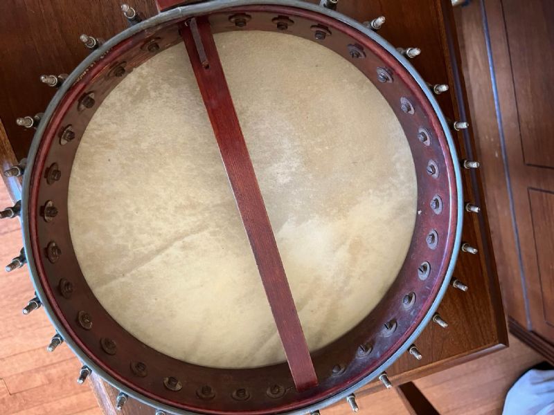 Got this banjo recently. It's an oldie, tapered peg tuners, spunover pot, gotta be 30+ hooks on it. Looks like it's got a little tone hoop under the head.