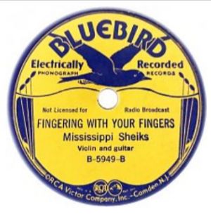 “Fingering with Your Fingers” is by the Mississippi Sheiks. It was recorded on January 19, 1935, in New Orleans for the Victor Company and released as one side of a 10” 78 rpm shellac disk under the Bluebird label. The Sheiks/Chatmon brothers (see below) were busy that day. Bo Carter (Armenter Chatmon) recorded 12 songs (10 solo guitar/vocal and two with the addition of piano, probably played by his brother Harry). The Sheiks recorded seven songs (fiddle, guitar, and vocal) and one tune (“Fingering with Your Fingers”). Harry Carter (Chatmon) recorded two songs with piano, vocal, and guitar (Bo Carter?). Information from the DAHR and Discogs. “Fingering with Your Fingers” was later released in 1991 as a track on Document Records’ “Mississippi Sheiks & Chatman Brothers – Complete Recorded Works In Chronological Order: Volume 4 (26 March 1934 To 15 October 1936)” and is available at YouTube from The Orchard Enterprise (so, not a copyright violation).