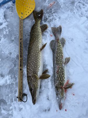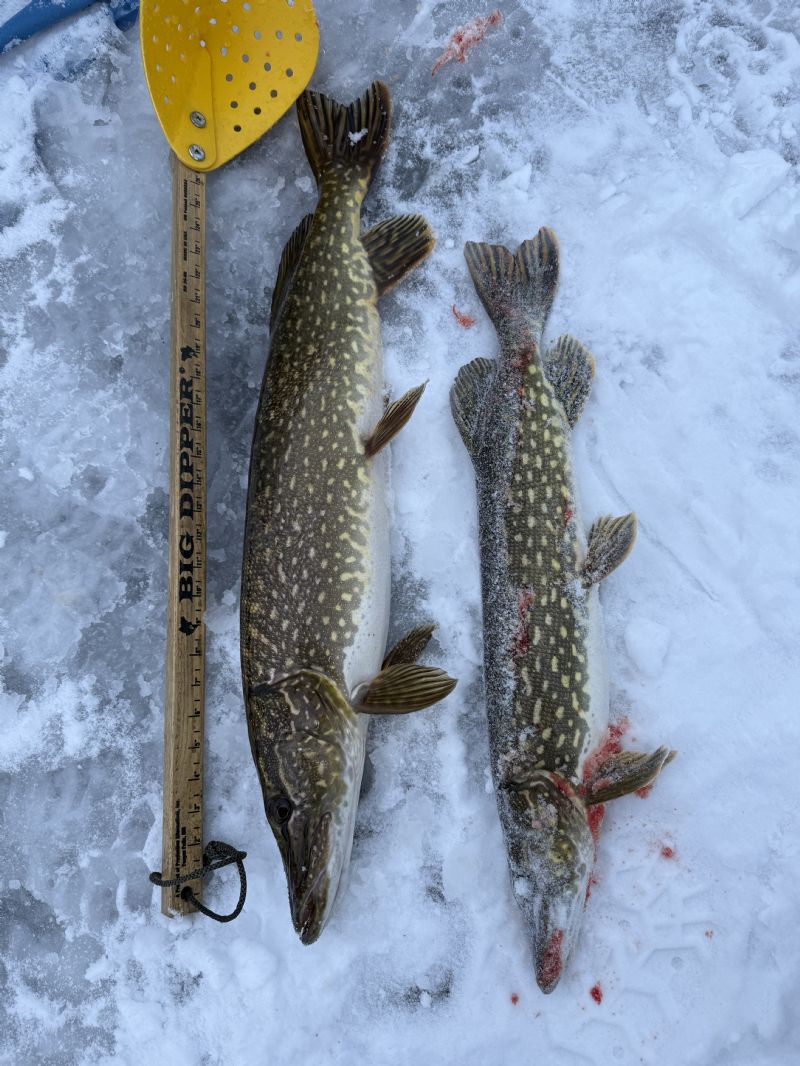 Good looking slimes Dale!! I love toothy gators, and honestly often prefer them to eat after a summer of Lake Erie walleye. Pike chowder is a fav, as well as pike patties. We are just getting some walkable ice, but its getting warm this week so I think were gonna loose it...DAMN!!! As far as ATVs in the cold...I have a truck battery mounted on my back rack and use it rather than the tiny ATV batteries...always lots of juice..
